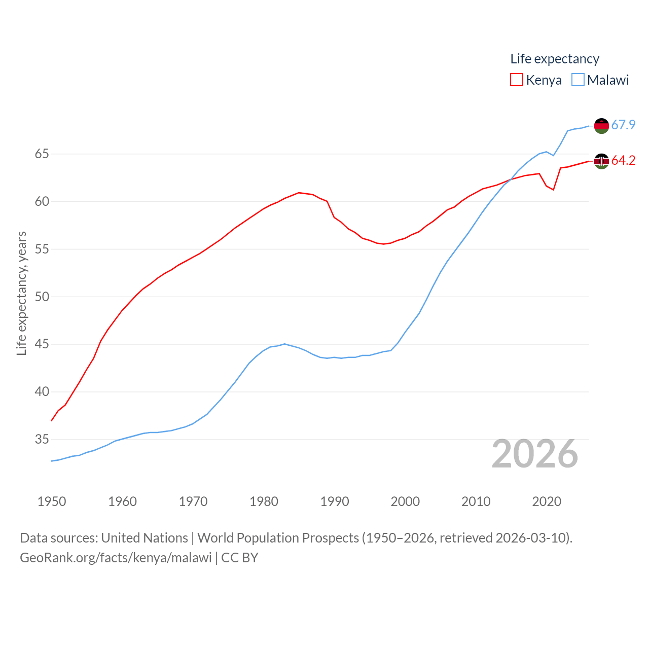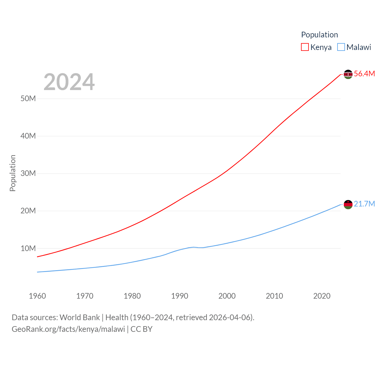Kenya has a population of 56.4M (ranked 26/197), compared with 21.7M in Malawi (ranked 62/197). Kenya's land area is 224,278 sq mi versus 36,402 sq mi for Malawi (ranked 45th vs. 107th).