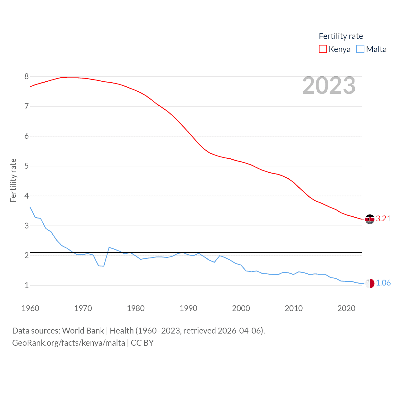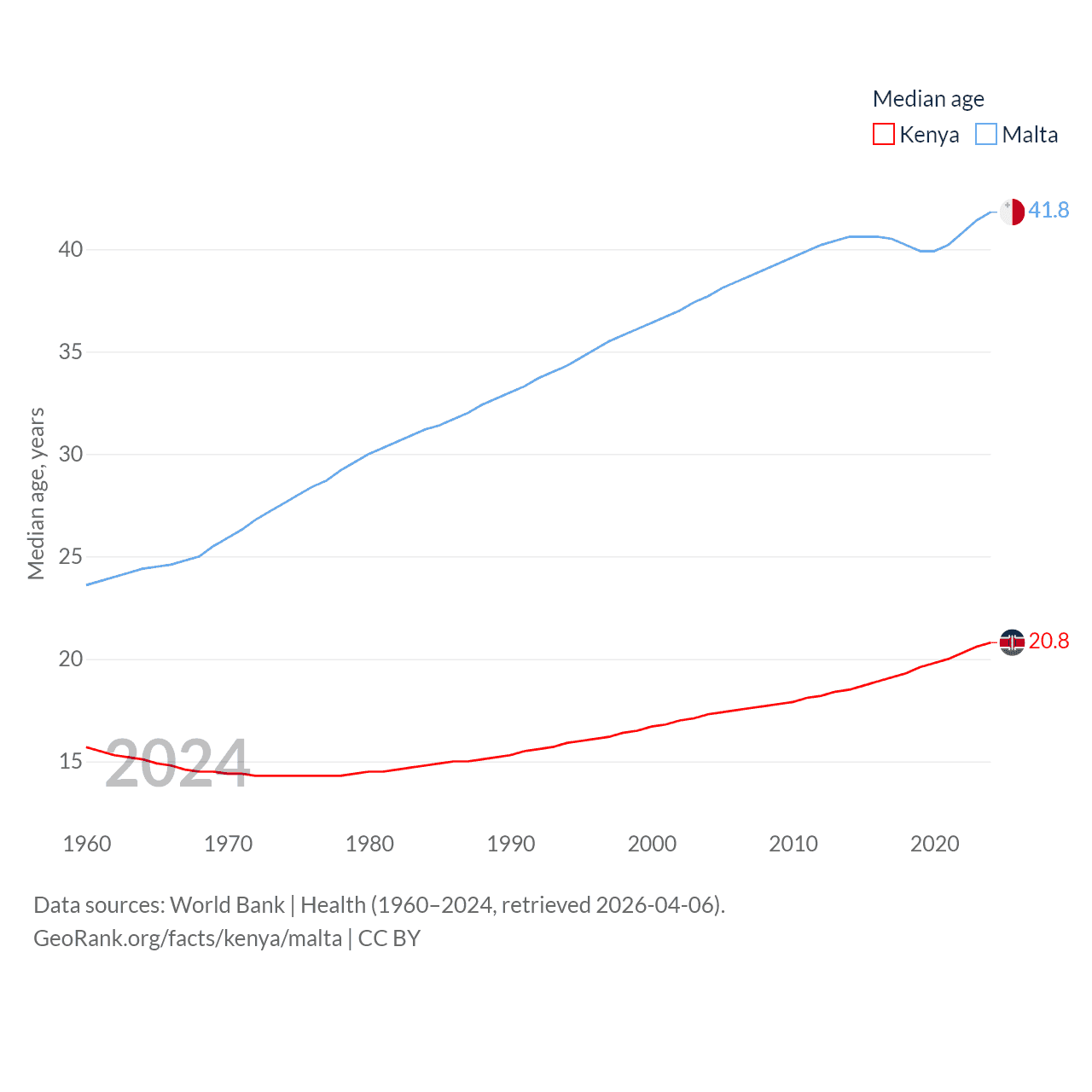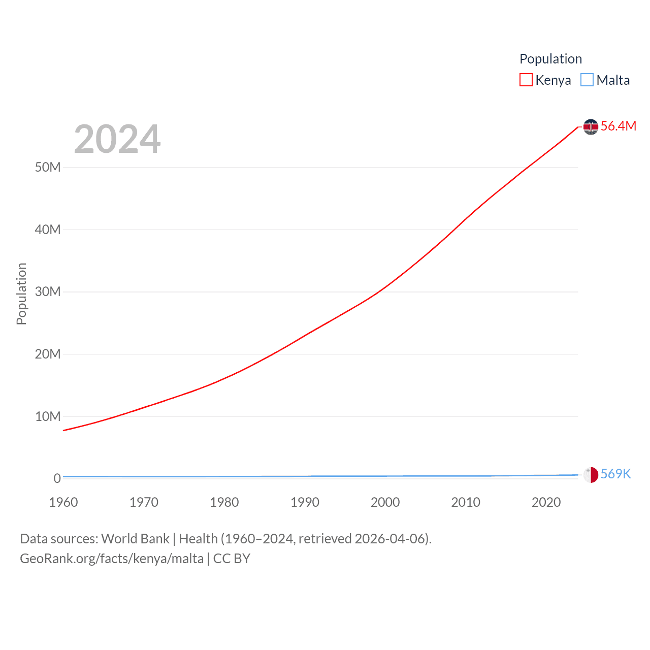Kenya has a population of 56.4M (ranked 26/197), compared with 569K in Malta (ranked 167/197). Kenya's land area is 224,278 sq mi versus 123.6 sq mi for Malta (ranked 45th vs. 187th).