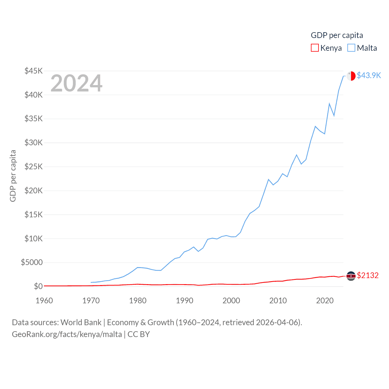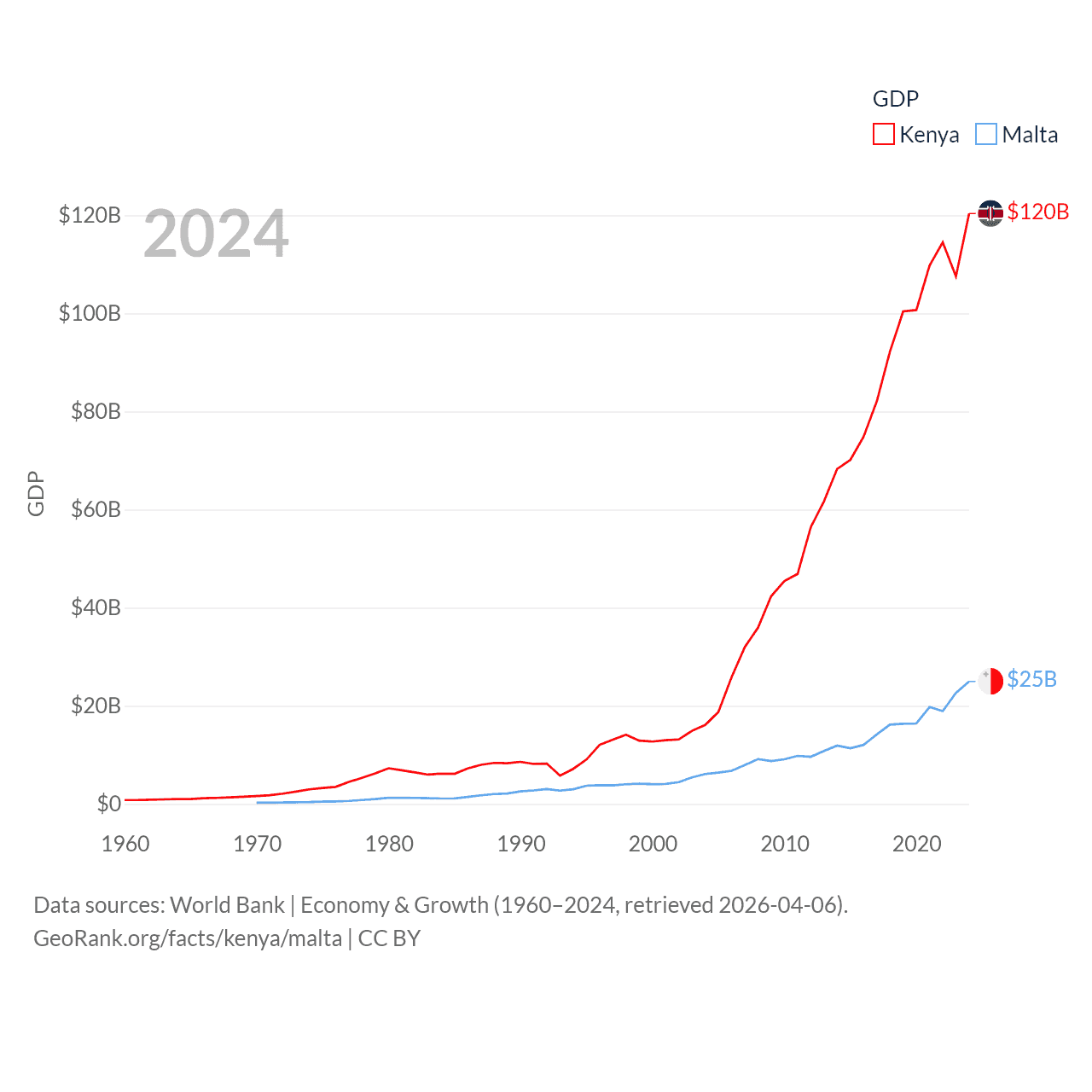 By GDP, Kenya ranks 64/197 ($120B) and Malta ranks 119/197 ($25B). By GDP per capita, Kenya ranks 154/197 ($2,132), while Malta ranks 28/197 ($43,899).