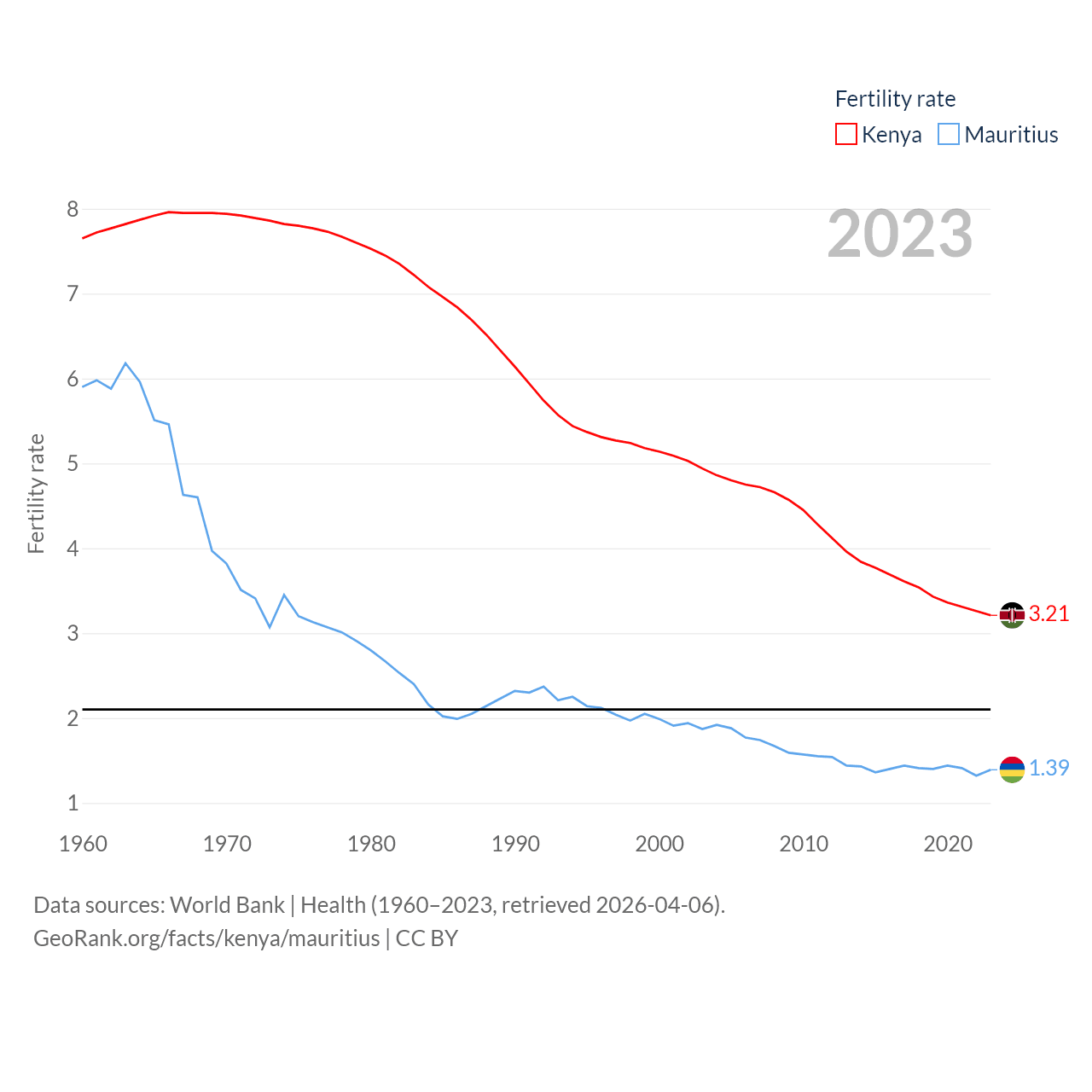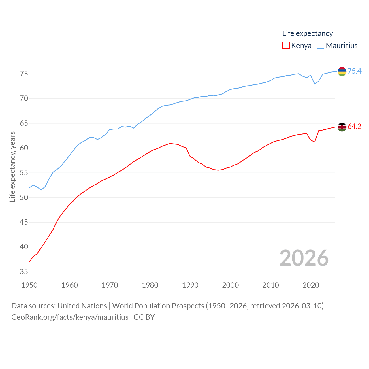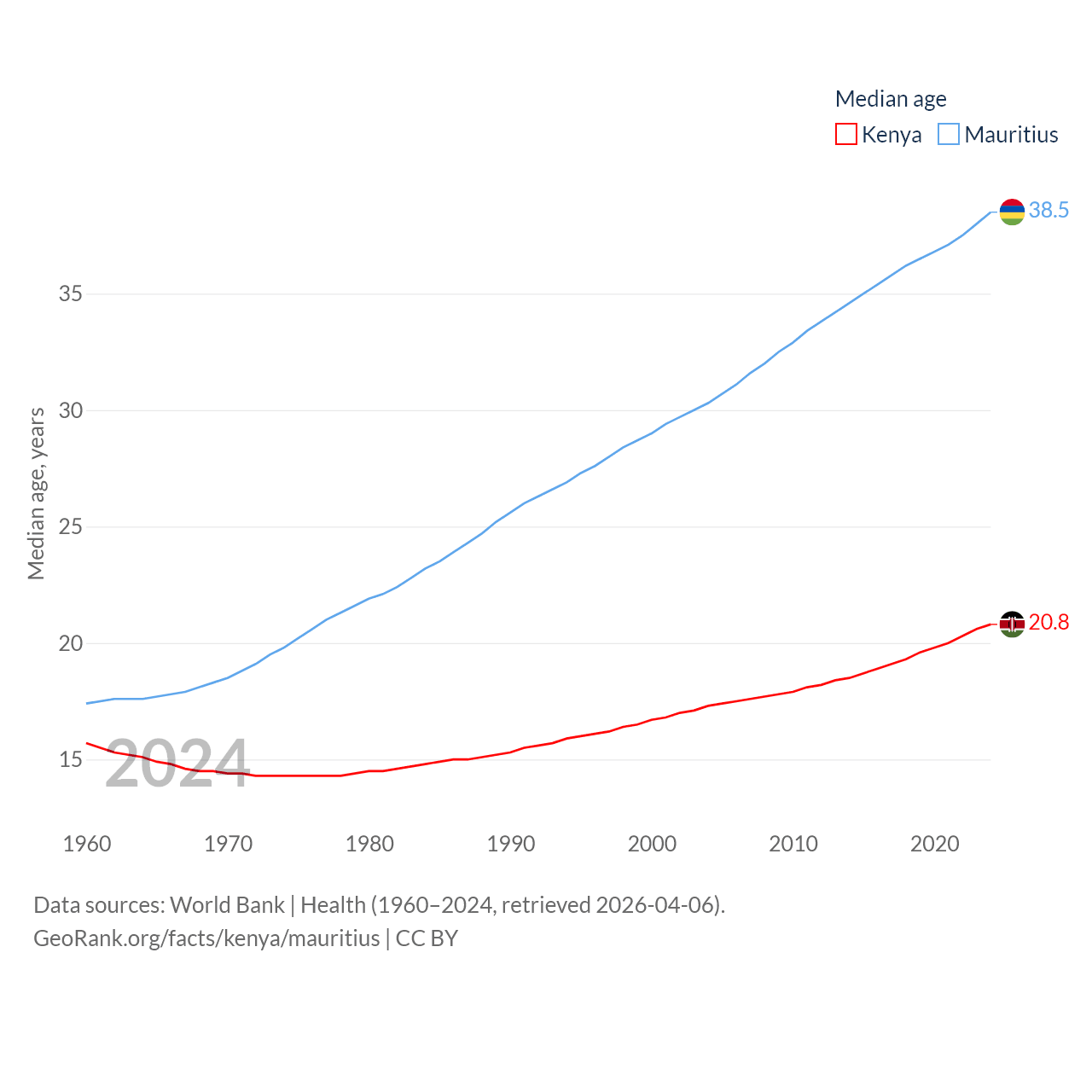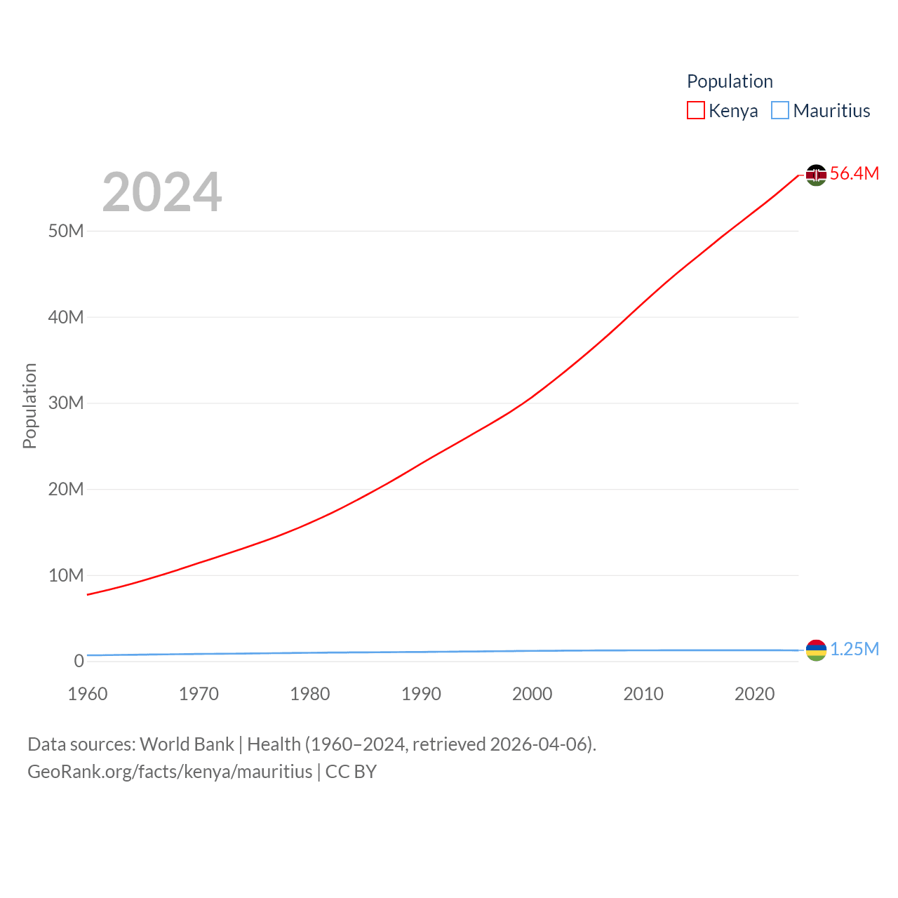 Kenya has a population of 56.4M (ranked 26/197), compared with 1.25M in Mauritius (ranked 156/197). Kenya's land area is 224,278 sq mi versus 771 sq mi for Mauritius (ranked 45th vs. 170th).