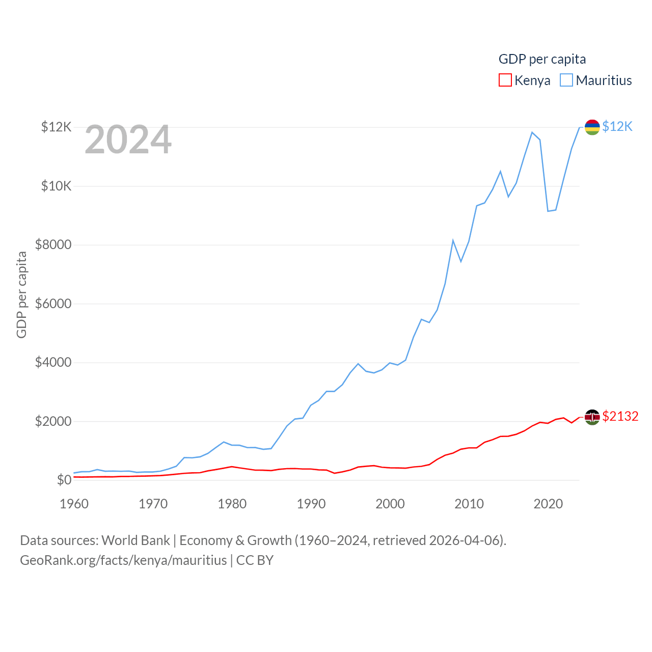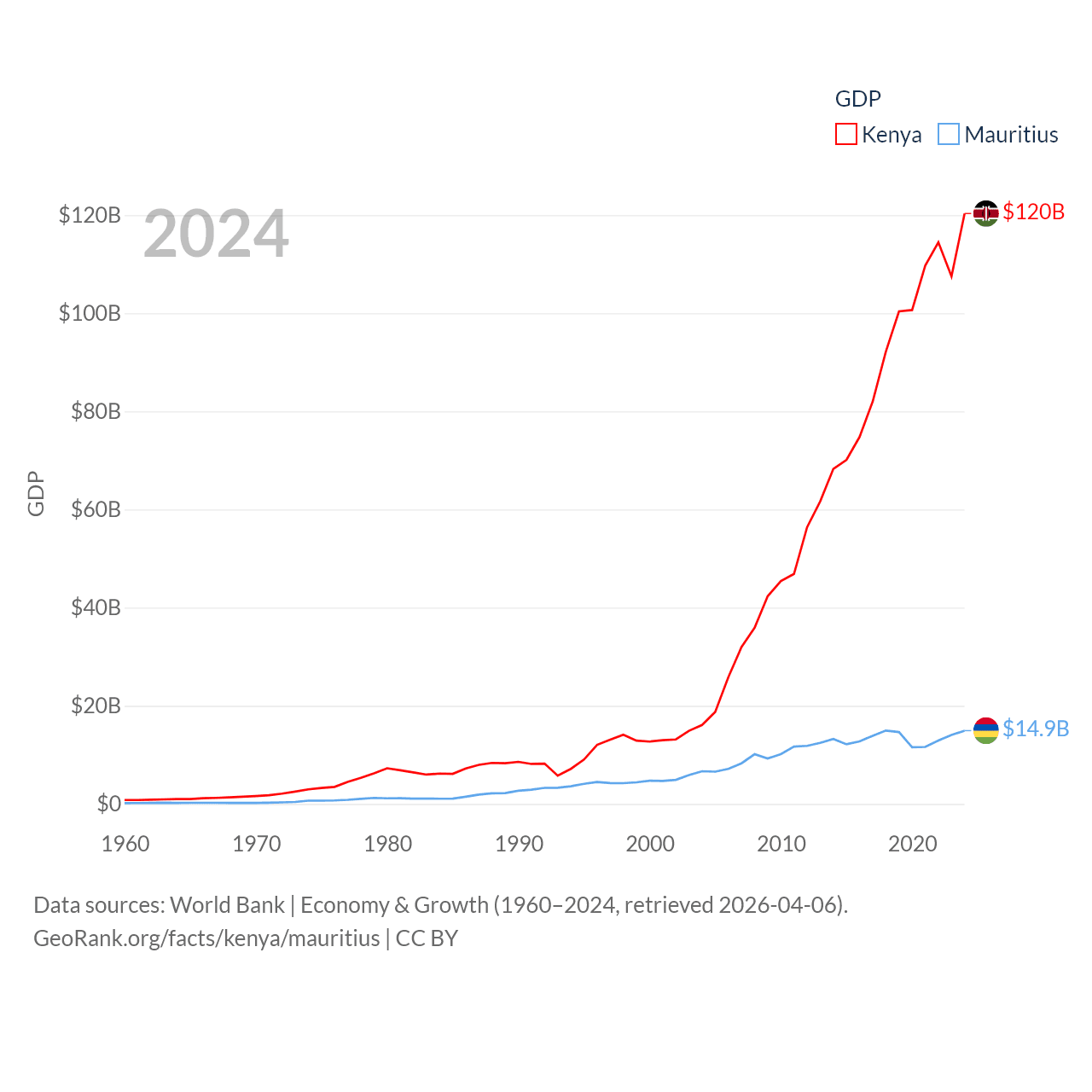 By GDP, Kenya ranks 64/197 ($120B) and Mauritius ranks 143/197 ($14.9B). By GDP per capita, Kenya ranks 154/197 ($2,132), while Mauritius ranks 78/197 ($11,991).