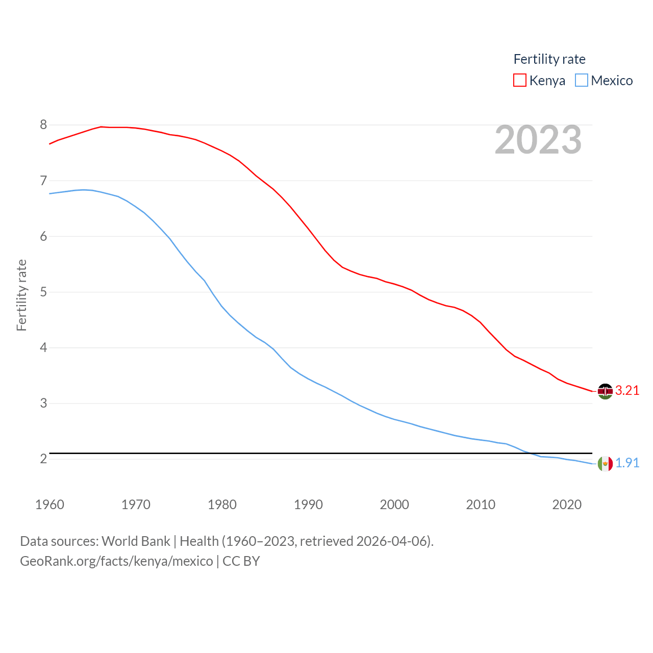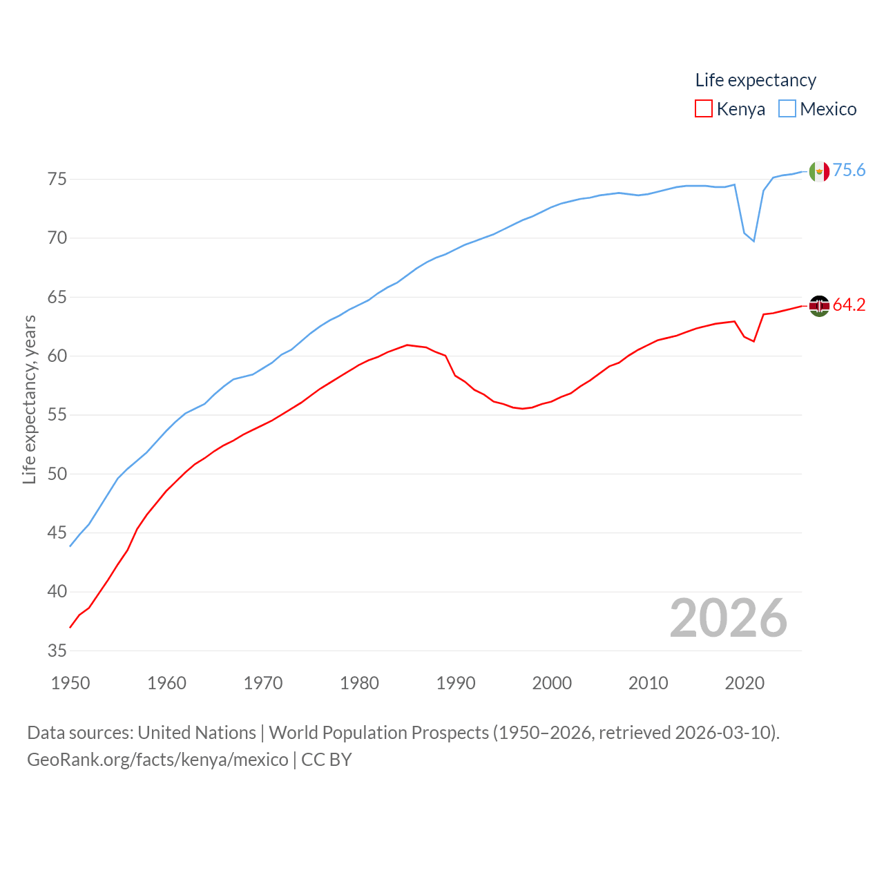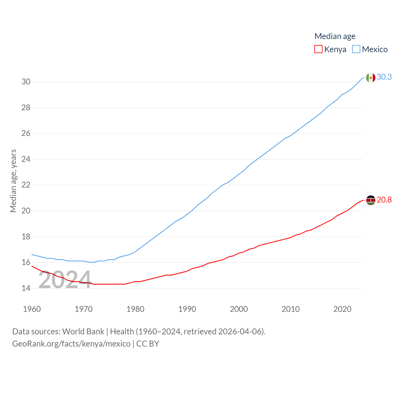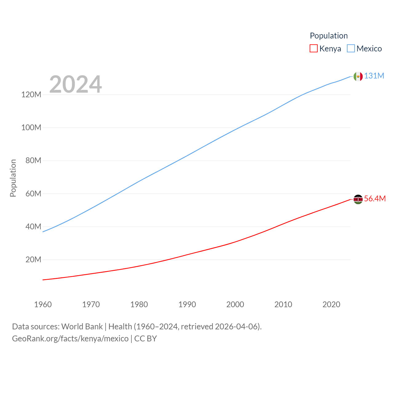 Kenya has a population of 56.4M (ranked 26/197), compared with 131M in Mexico (ranked 11/197). Kenya's land area is 224,278 sq mi versus 750,563 sq mi for Mexico (ranked 45th vs. 13th).