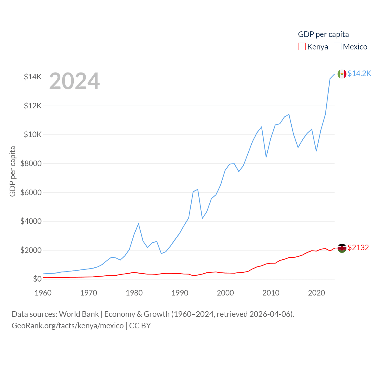By GDP, Kenya ranks 64/197 ($120B) and Mexico ranks 13/197 ($1.86T). By GDP per capita, Kenya ranks 154/197 ($2,132), while Mexico ranks 69/197 ($14,186).