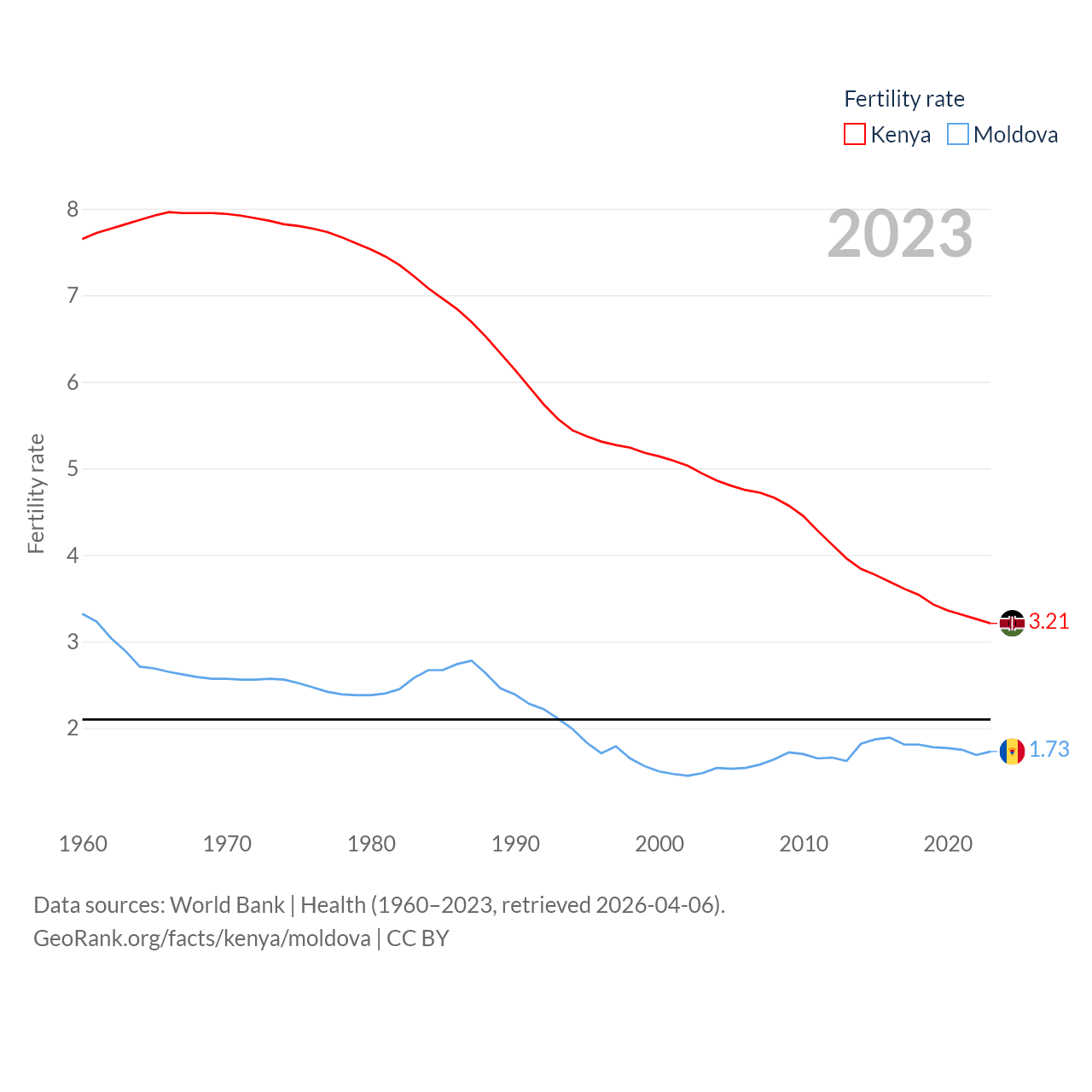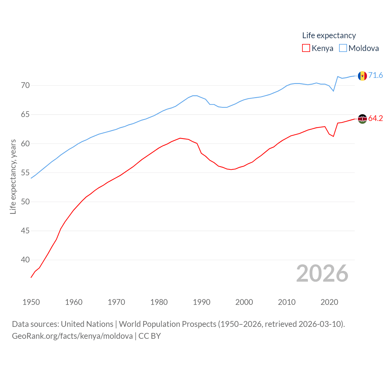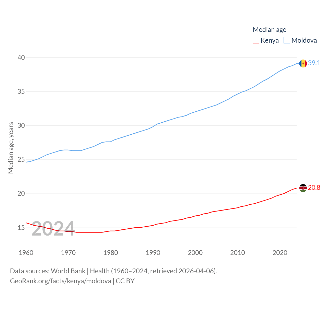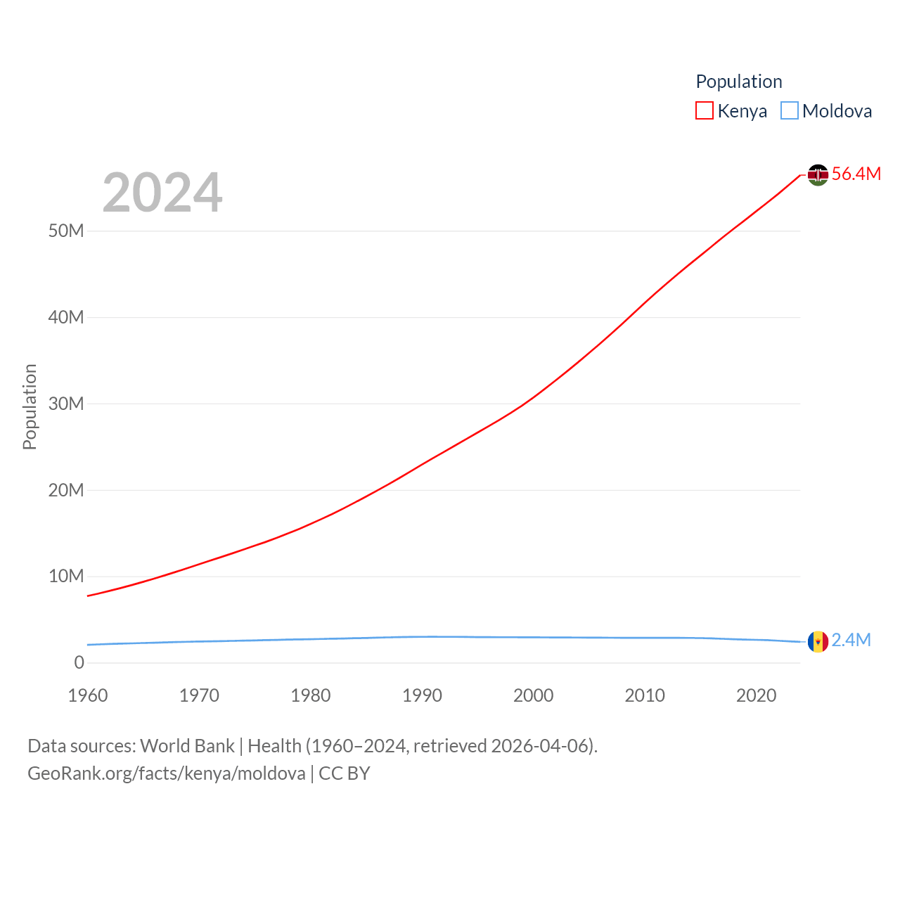 Kenya has a population of 56.4M (ranked 26/197), compared with 2.4M in Moldova (ranked 143/197). Kenya's land area is 224,278 sq mi versus 12,714 sq mi for Moldova (ranked 45th vs. 135th).