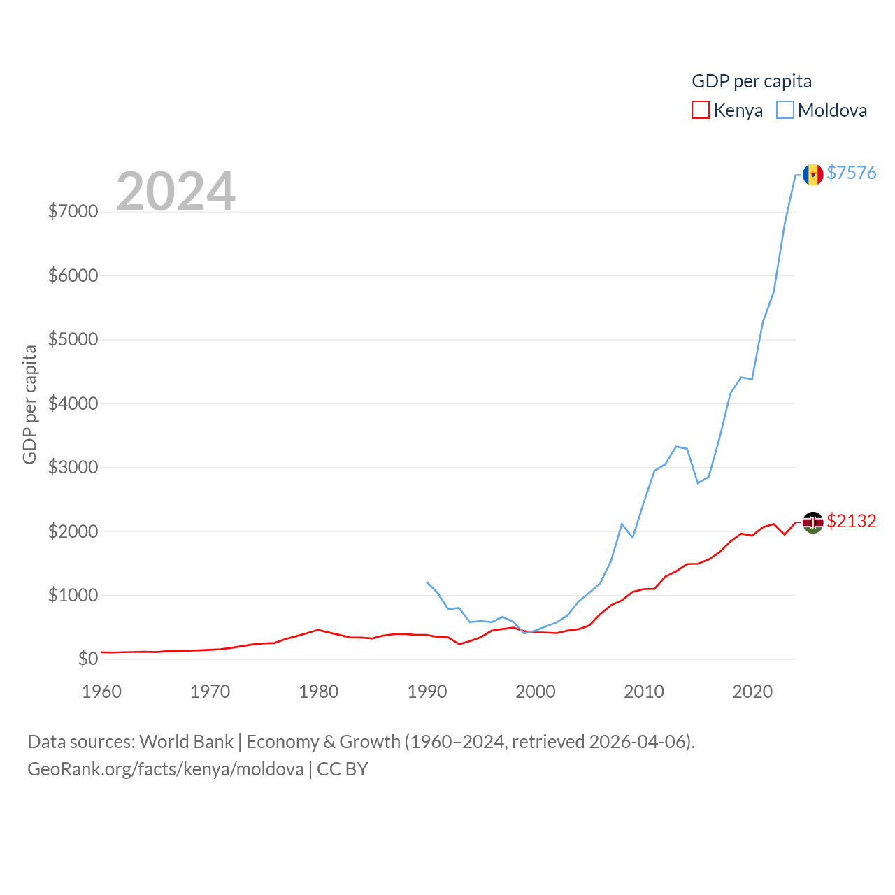 By GDP, Kenya ranks 64/197 ($120B) and Moldova ranks 134/197 ($18.2B). By GDP per capita, Kenya ranks 154/197 ($2,132), while Moldova ranks 99/197 ($7,576).