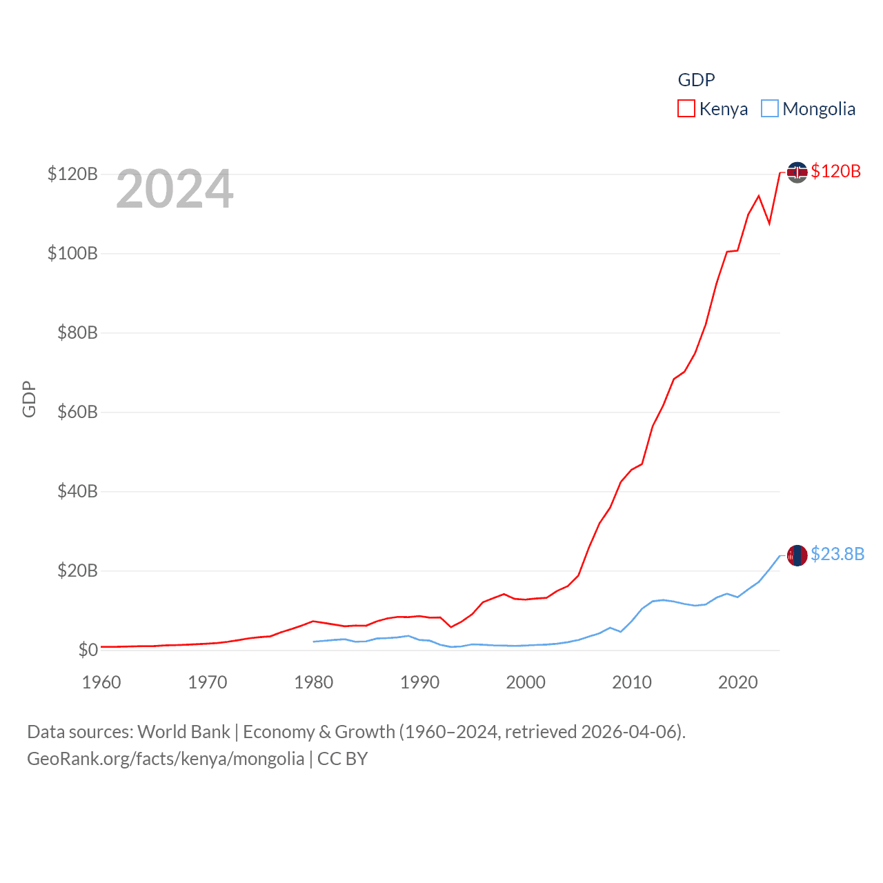 By GDP, Kenya ranks 64/197 ($120B) and Mongolia ranks 121/197 ($23.8B). By GDP per capita, Kenya ranks 154/197 ($2,132), while Mongolia ranks 105/197 ($6,751).