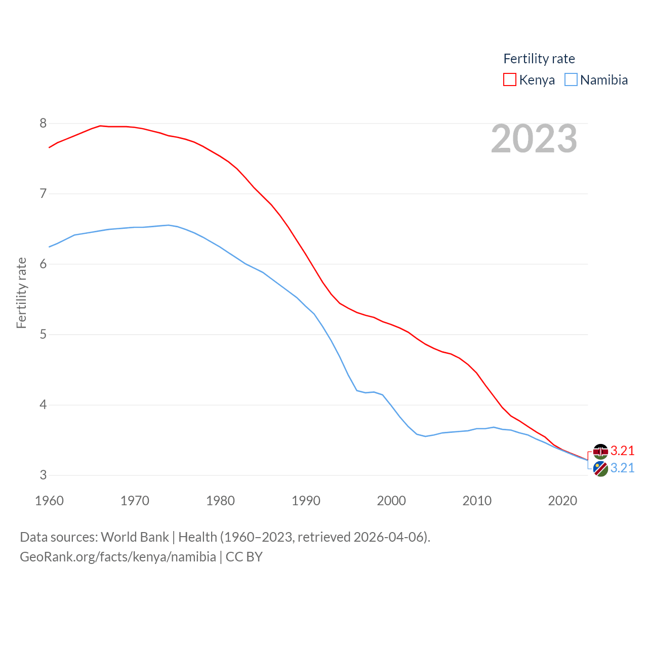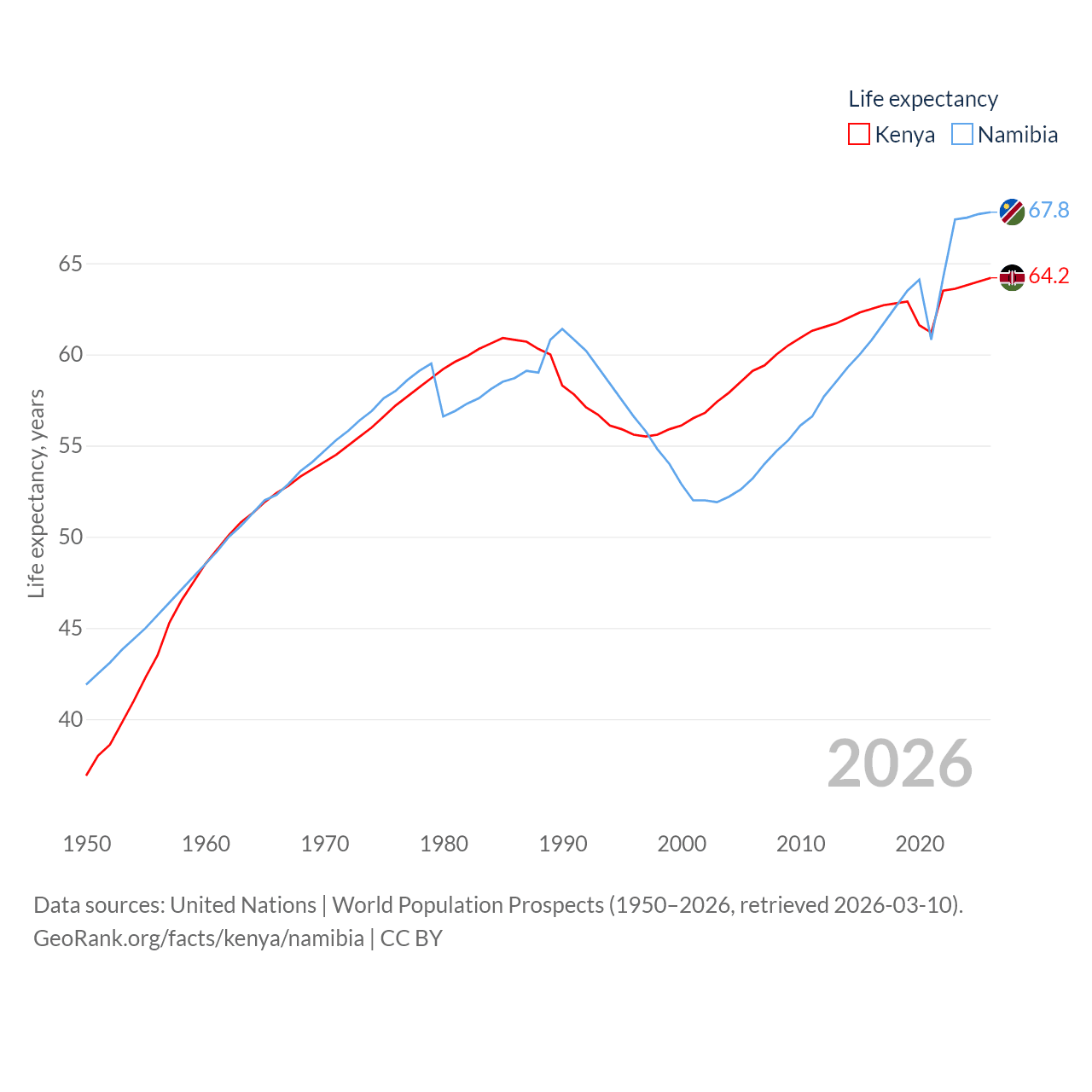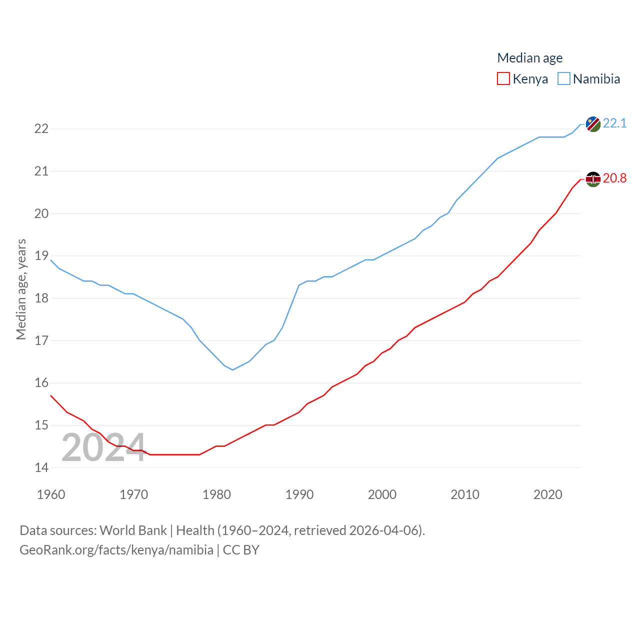 Kenya has a population of 56.4M (ranked 26/197), compared with 3.03M in Namibia (ranked 136/197). Kenya's land area is 224,278 sq mi versus 317,874 sq mi for Namibia (ranked 45th vs. 33rd).