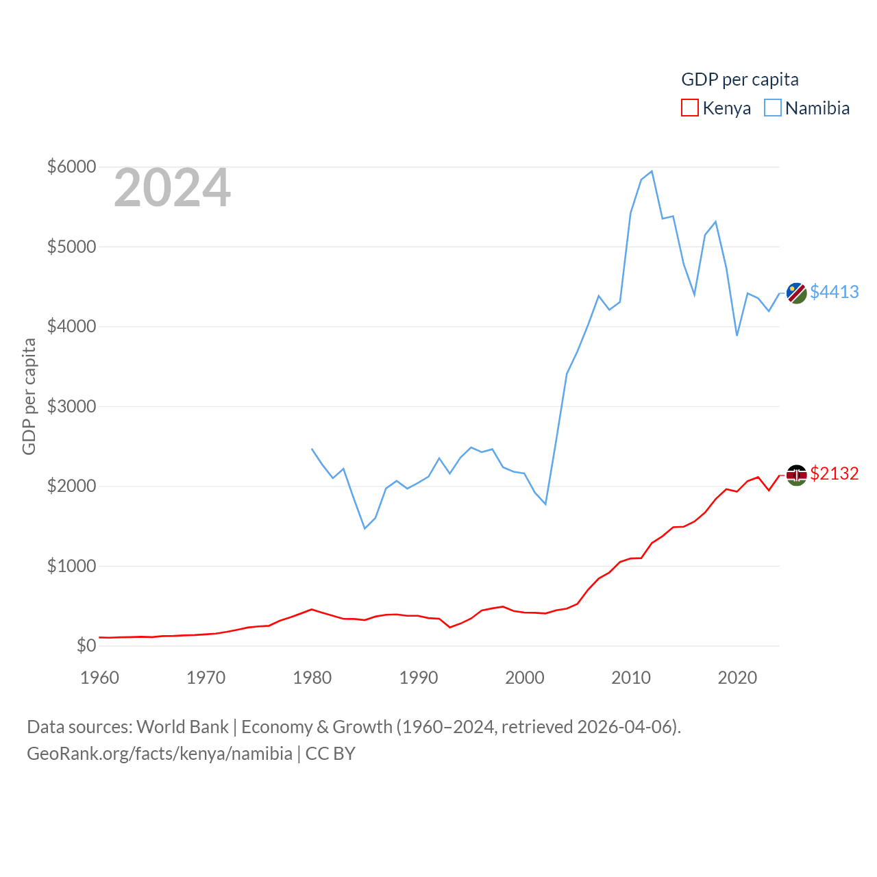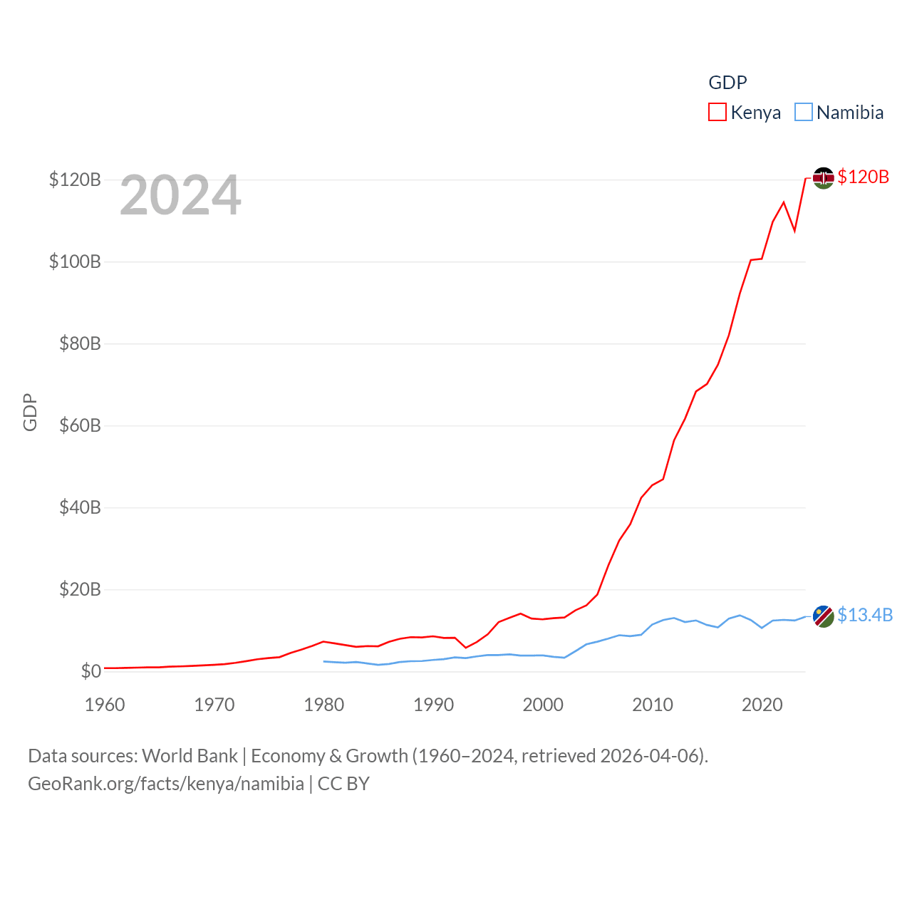 By GDP, Kenya ranks 64/197 ($120B) and Namibia ranks 147/197 ($13.4B). By GDP per capita, Kenya ranks 154/197 ($2,132), while Namibia ranks 126/197 ($4,413).