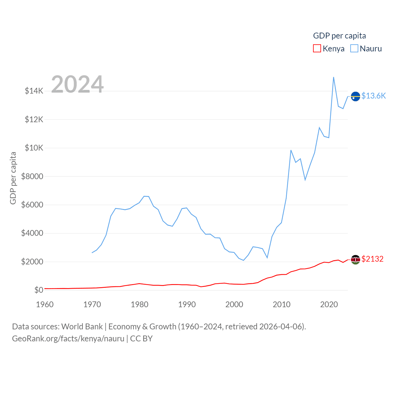 By GDP, Kenya ranks 64/197 ($120B) and Nauru ranks 195/197 ($163M). By GDP per capita, Kenya ranks 154/197 ($2,132), while Nauru ranks 74/197 ($13,609).