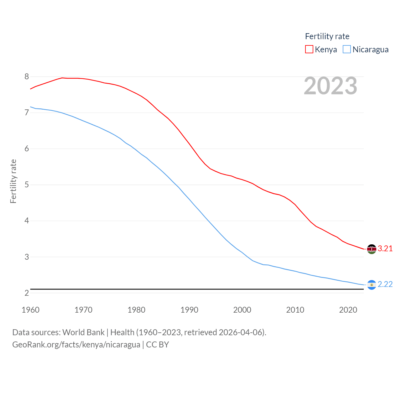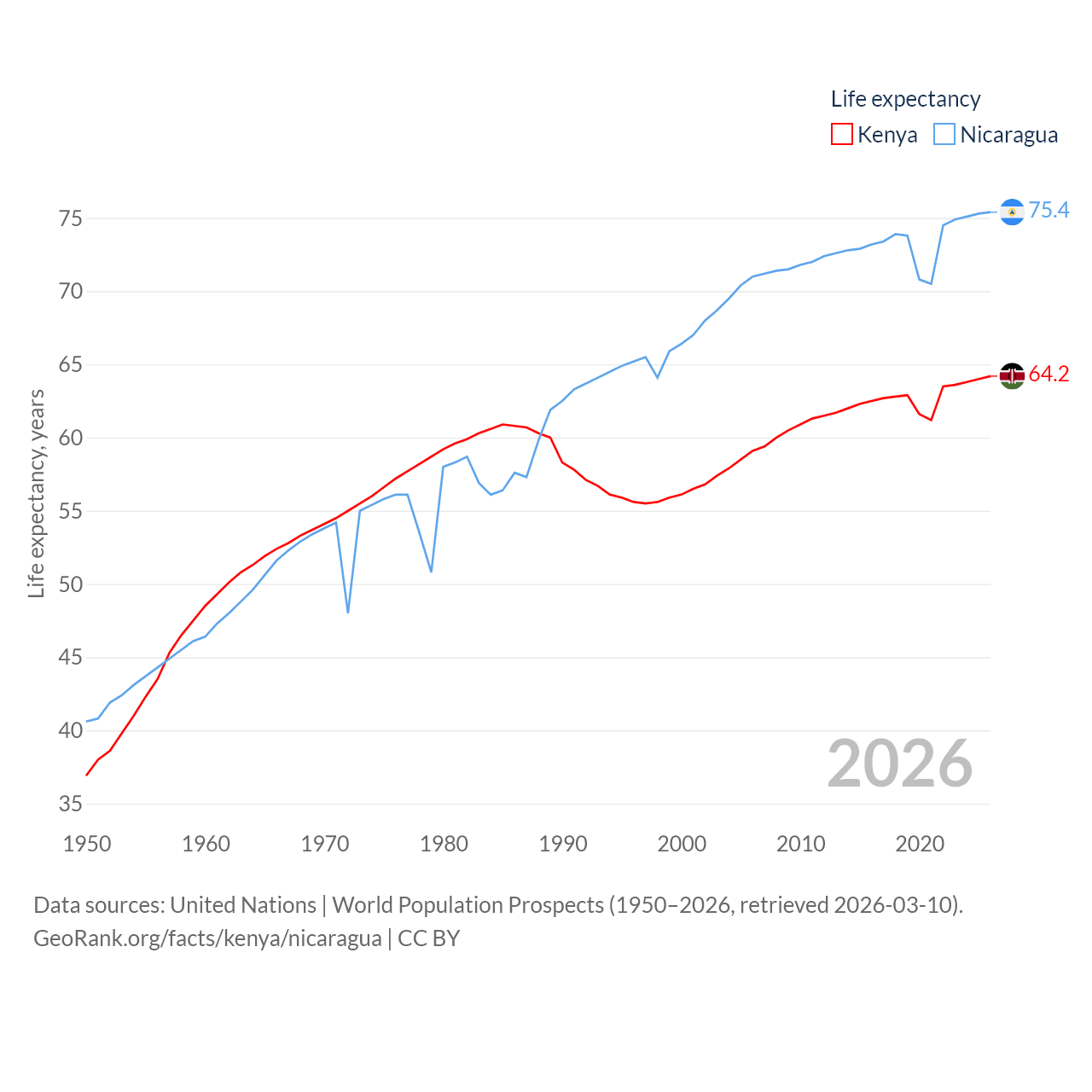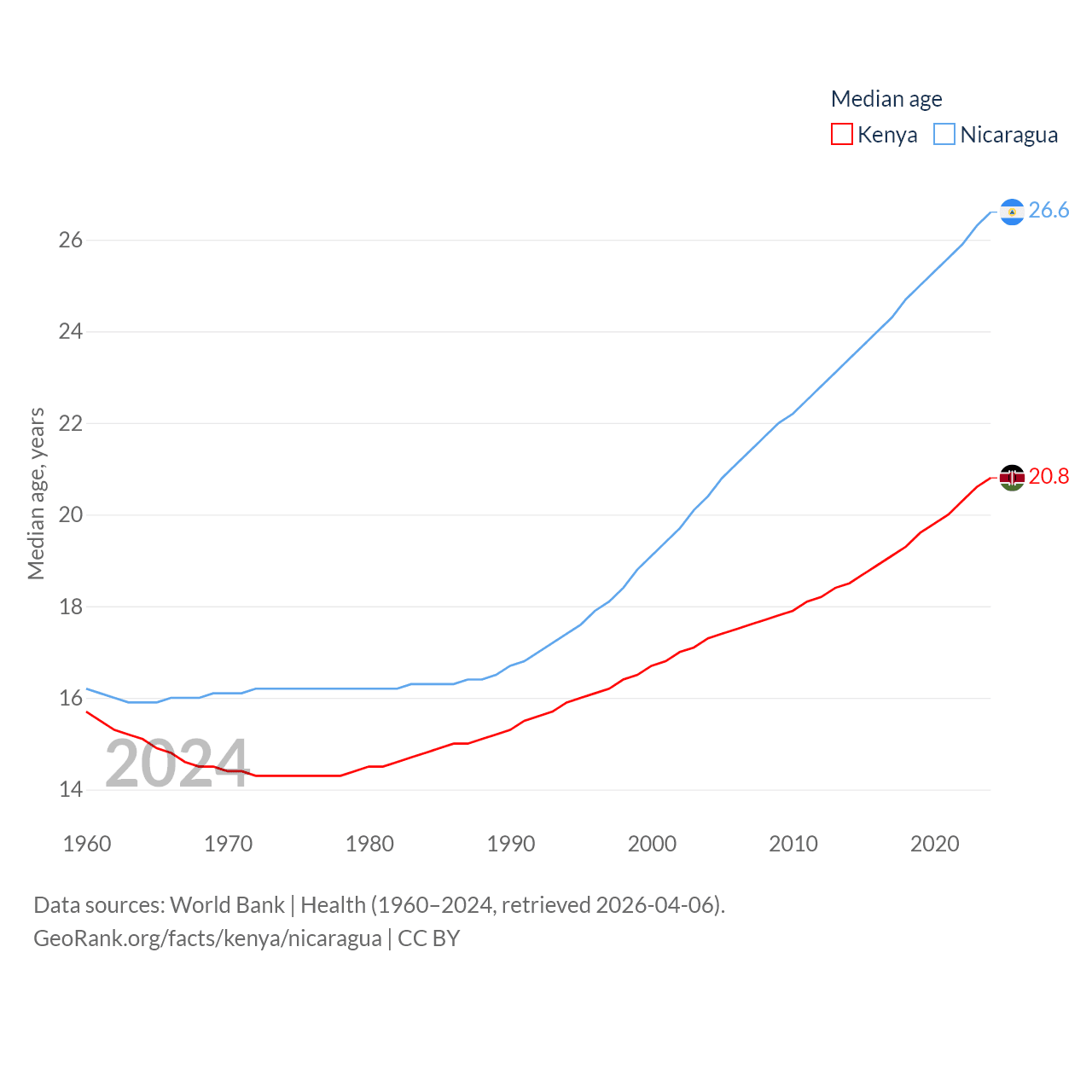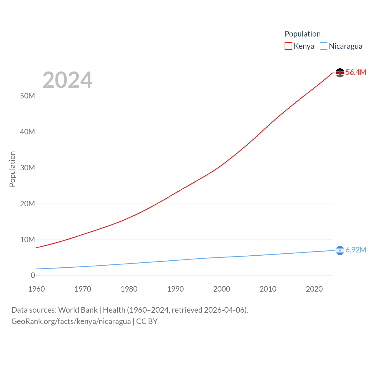 Kenya has a population of 56.4M (ranked 26/197), compared with 6.92M in Nicaragua (ranked 108/197). Kenya's land area is 224,278 sq mi versus 46,464 sq mi for Nicaragua (ranked 45th vs. 98th).