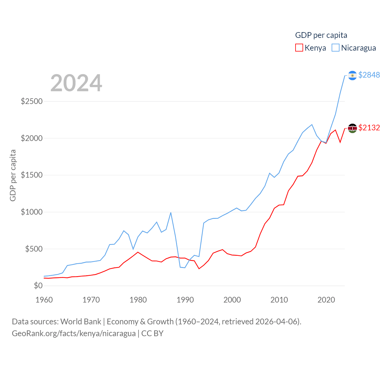 By GDP, Kenya ranks 64/197 ($120B) and Nicaragua ranks 131/197 ($19.7B). By GDP per capita, Kenya ranks 154/197 ($2,132), while Nicaragua ranks 141/197 ($2,848).
