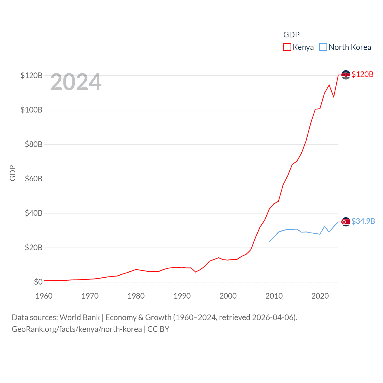 By GDP, Kenya ranks 64/197 ($120B) and North Korea ranks 106/197 ($34.9B). By GDP per capita, Kenya ranks 154/197 ($2,132), while North Korea ranks 168/197 ($1,319).