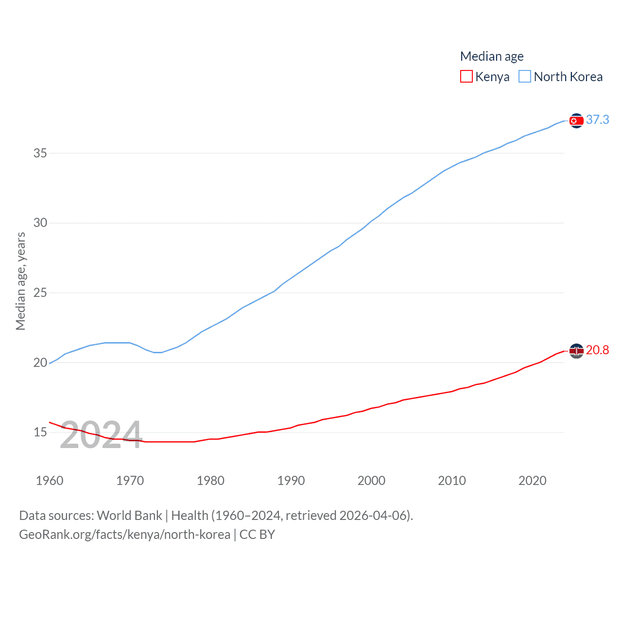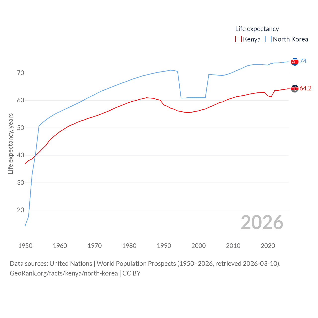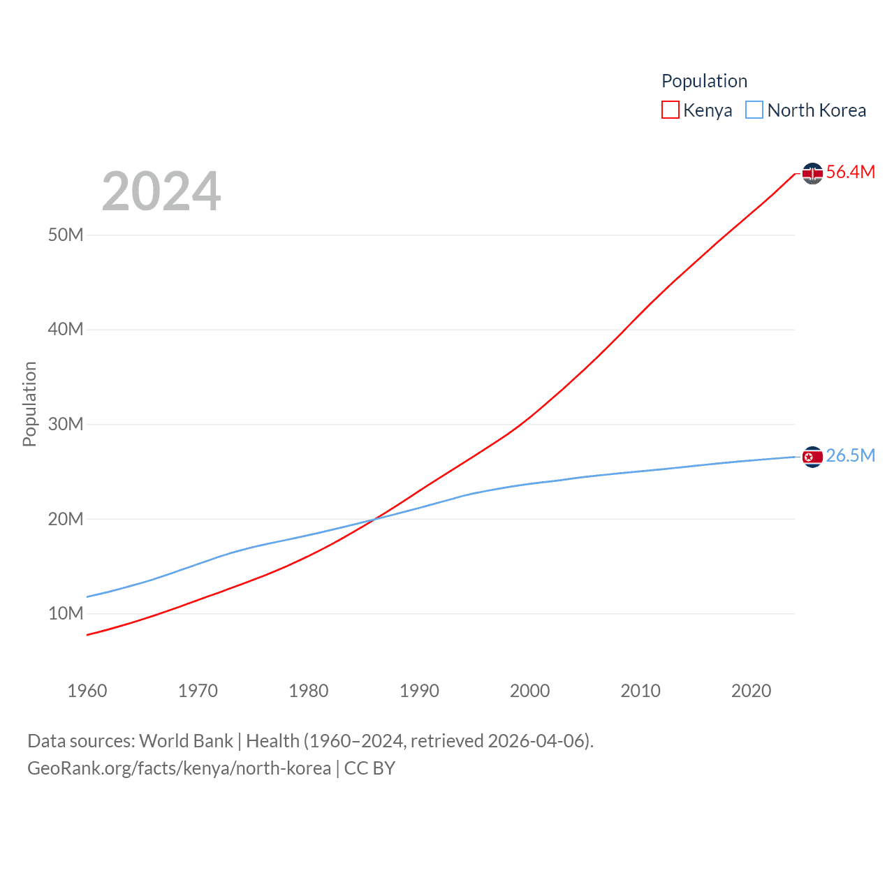 Kenya has a population of 56.4M (ranked 26/197), compared with 26.5M in North Korea (ranked 56/197). Kenya's land area is 224,278 sq mi versus 46,491 sq mi for North Korea (ranked 45th vs. 97th).