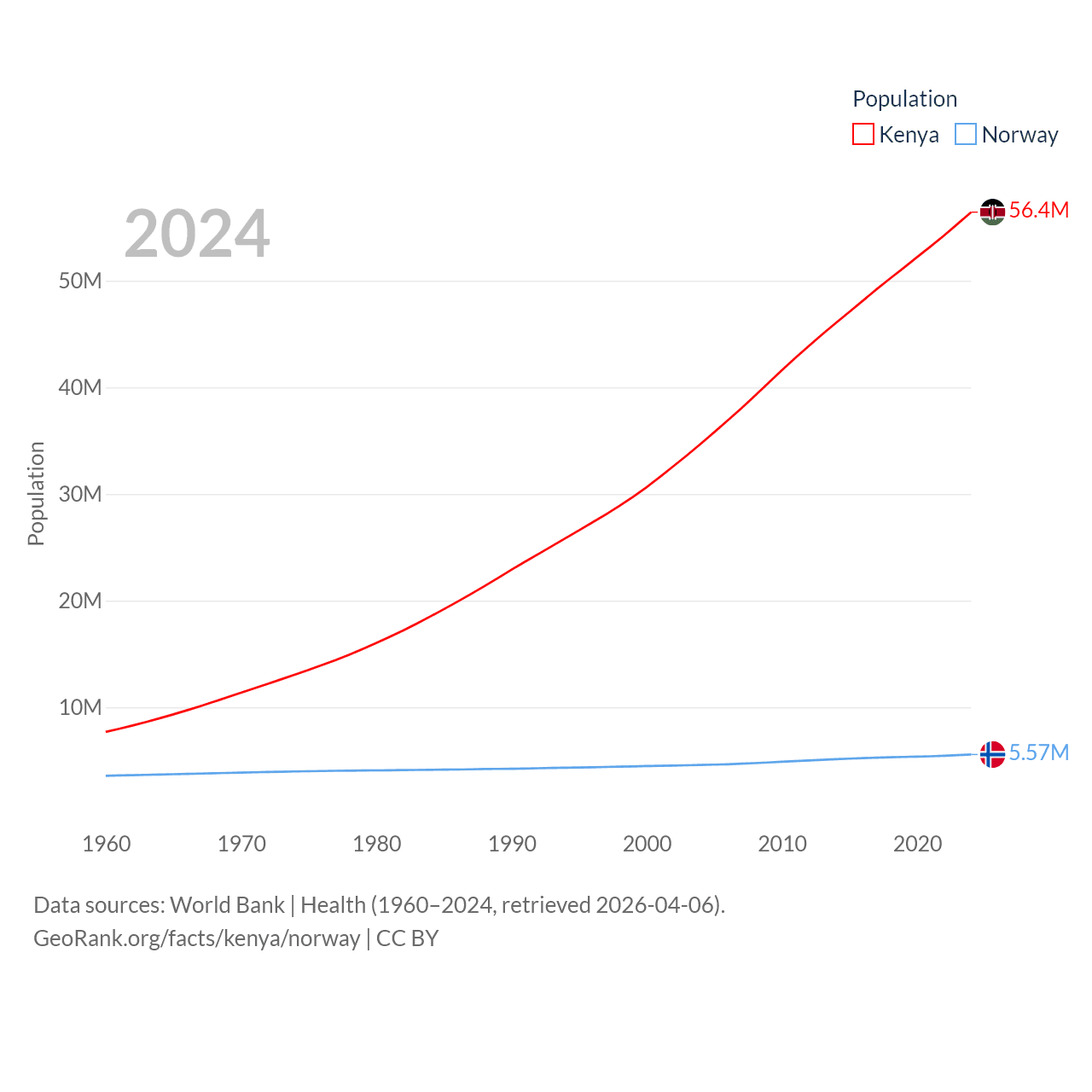 Kenya has a population of 56.4M (ranked 26/197), compared with 5.57M in Norway (ranked 118/197). Kenya's land area is 224,278 sq mi versus 140,645 sq mi for Norway (ranked 45th vs. 62nd).