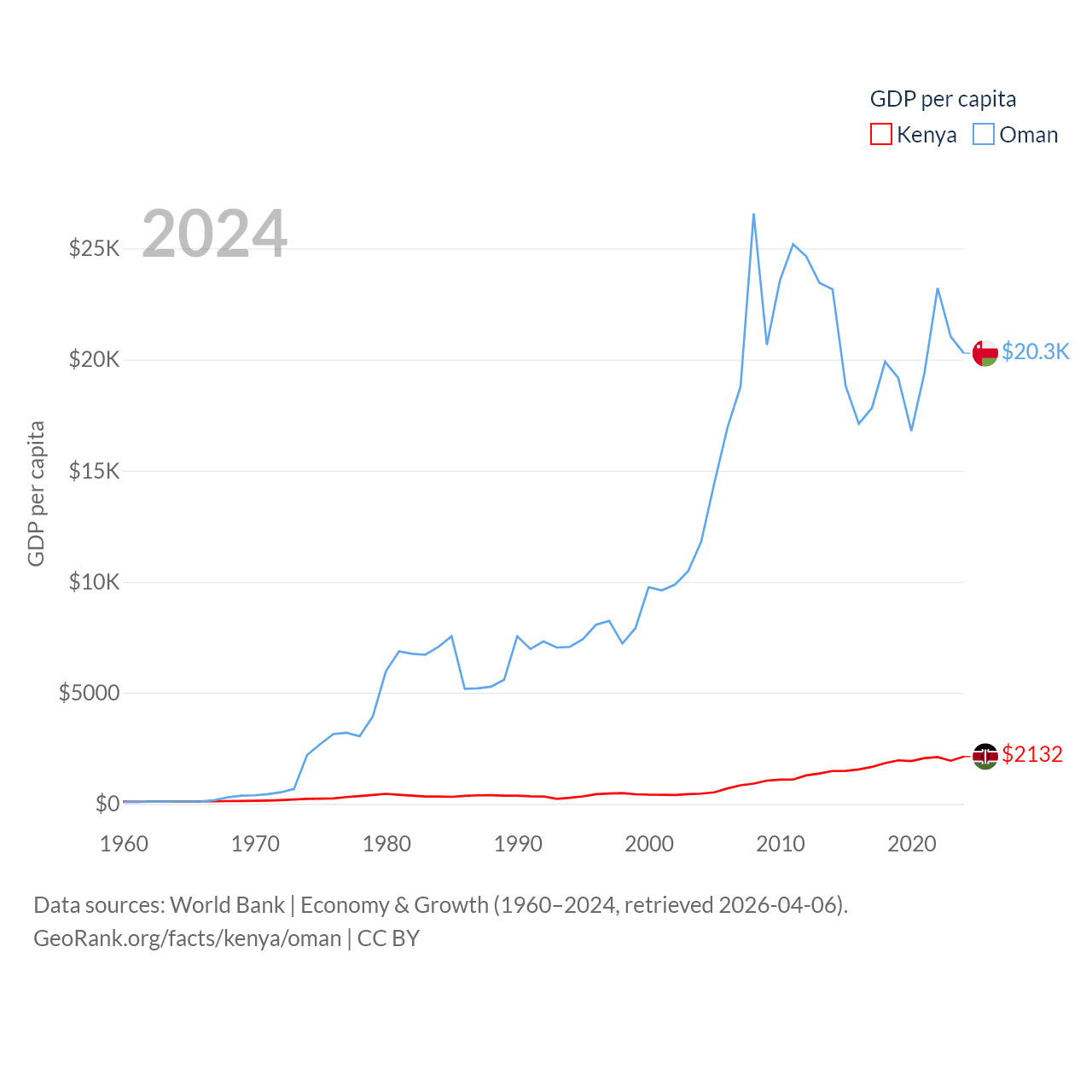 By GDP, Kenya ranks 64/197 ($120B) and Oman ranks 70/197 ($107B). By GDP per capita, Kenya ranks 154/197 ($2,132), while Oman ranks 57/197 ($20,285).