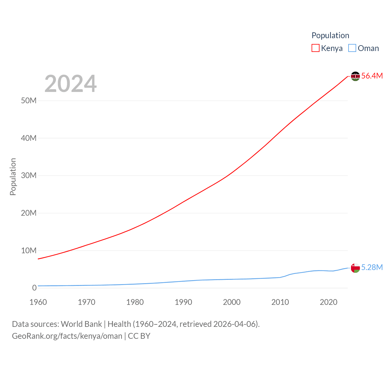 Kenya has a population of 56.4M (ranked 26/197), compared with 5.28M in Oman (ranked 124/197). Kenya's land area is 224,278 sq mi versus 119,499 sq mi for Oman (ranked 45th vs. 68th).