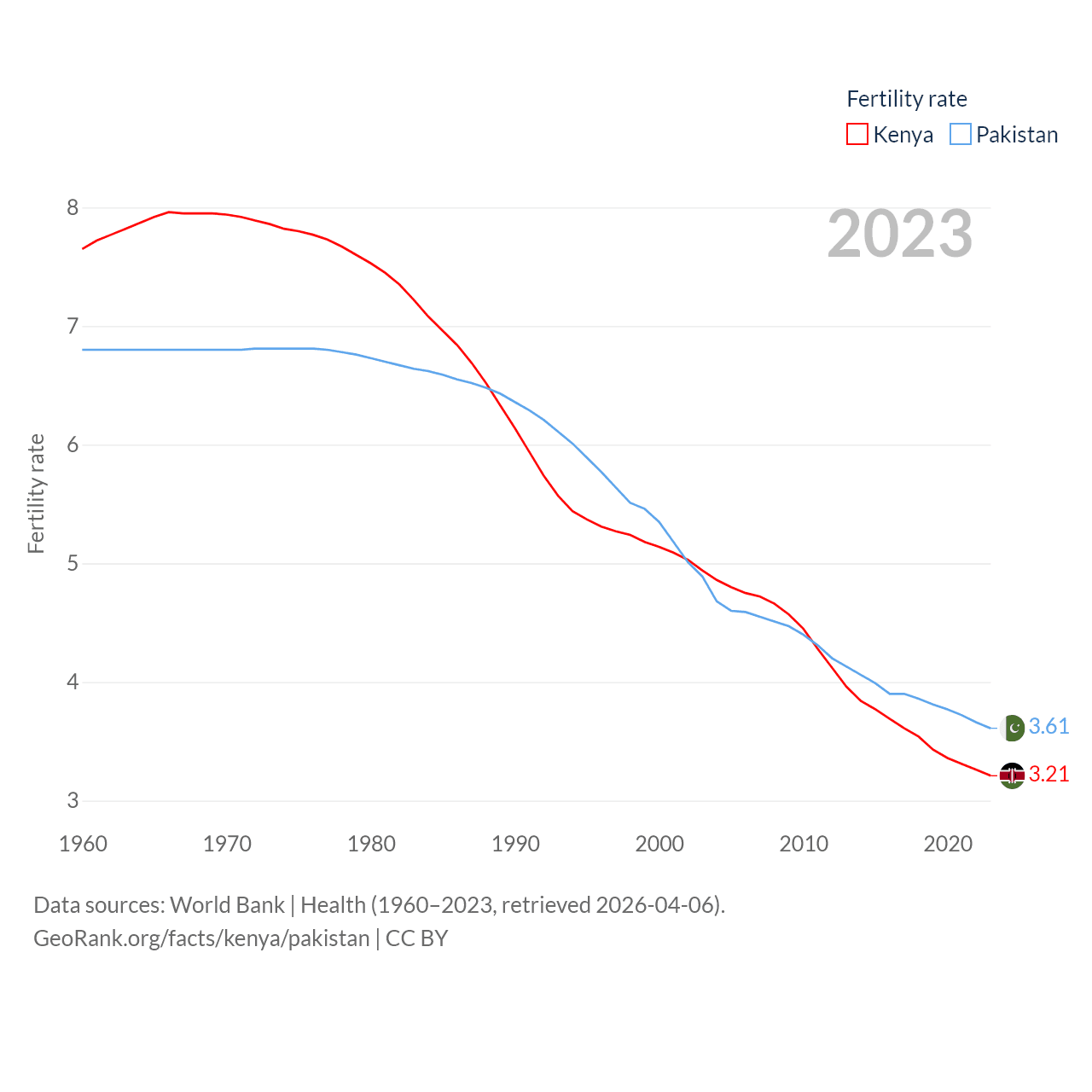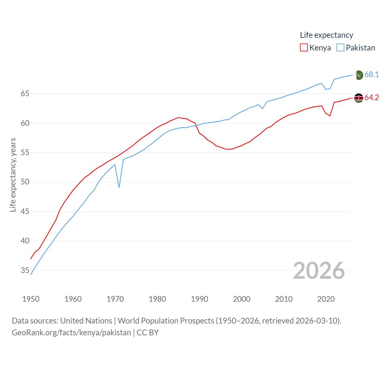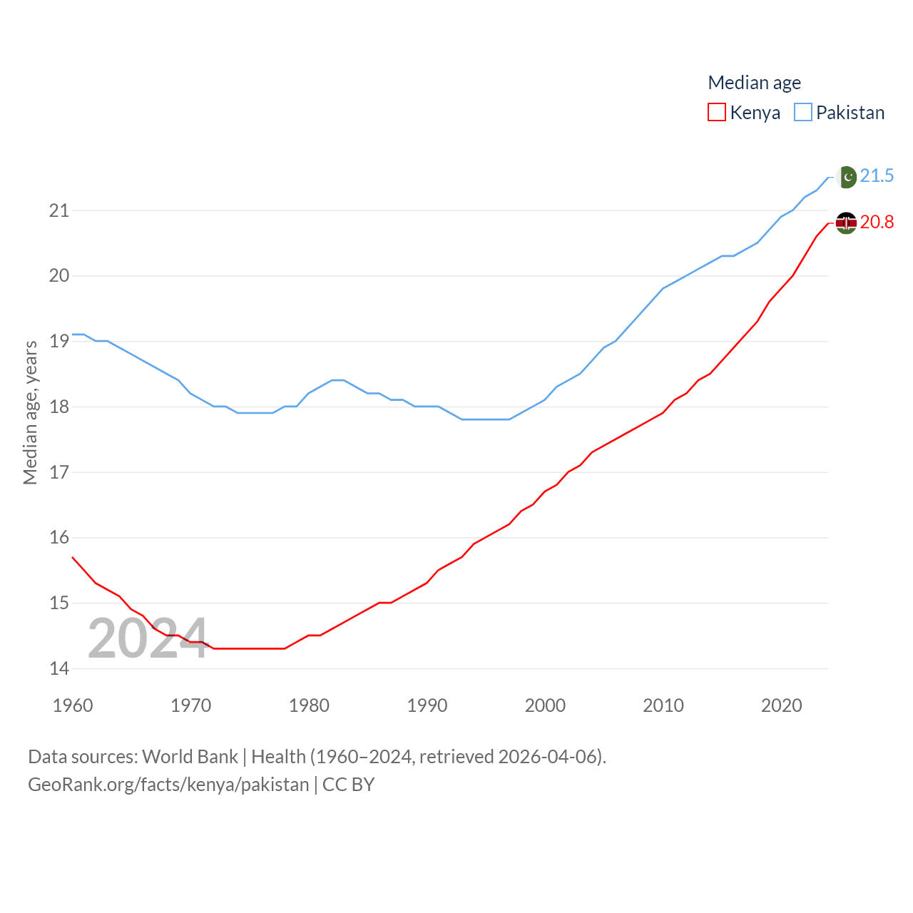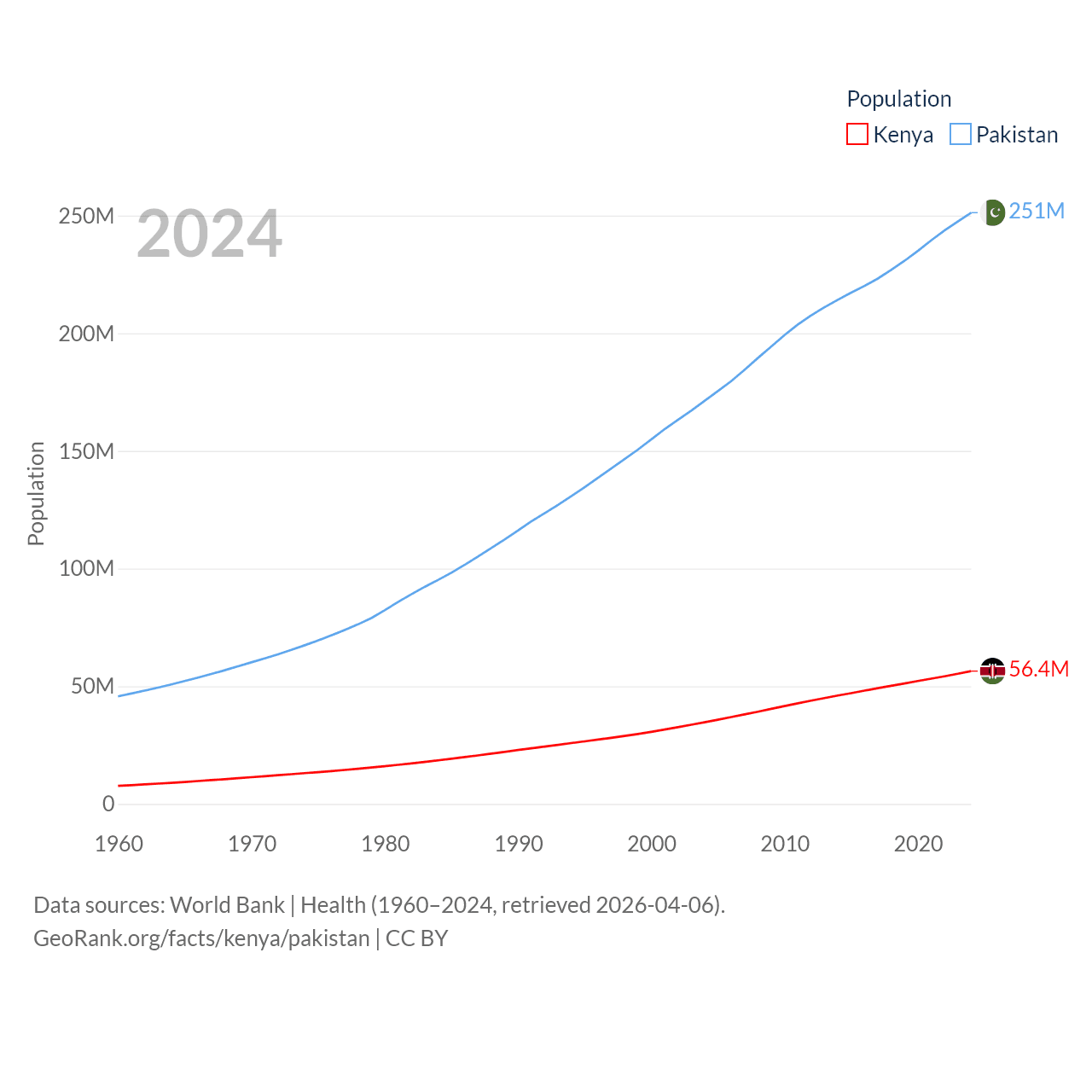 Kenya has a population of 56.4M (ranked 26/197), compared with 251M in Pakistan (ranked 5/197). Kenya's land area is 224,278 sq mi versus 297,638 sq mi for Pakistan (ranked 45th vs. 35th).