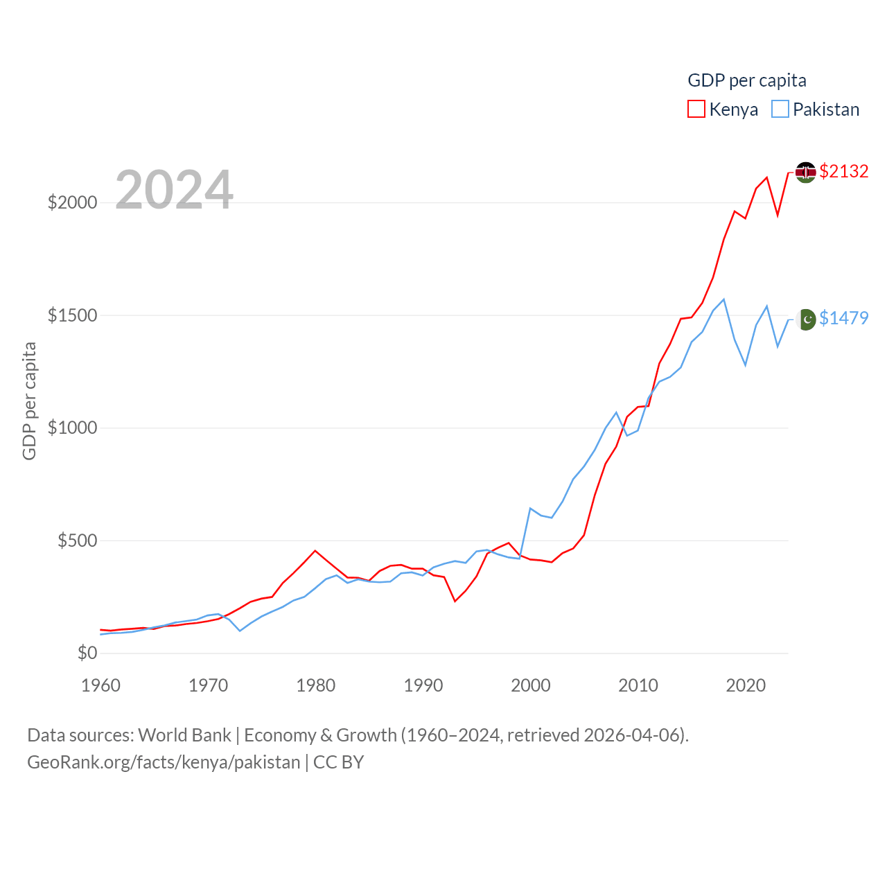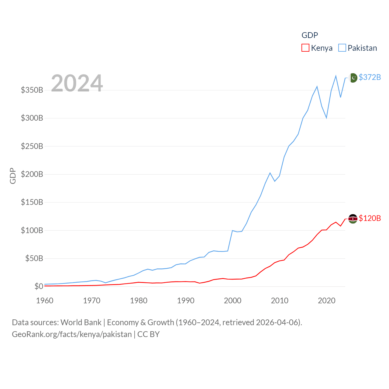 By GDP, Kenya ranks 64/197 ($120B) and Pakistan ranks 43/197 ($372B). By GDP per capita, Kenya ranks 154/197 ($2,132), while Pakistan ranks 163/197 ($1,479).