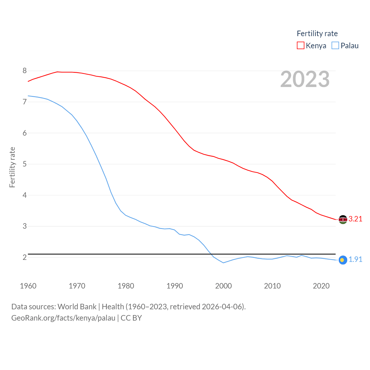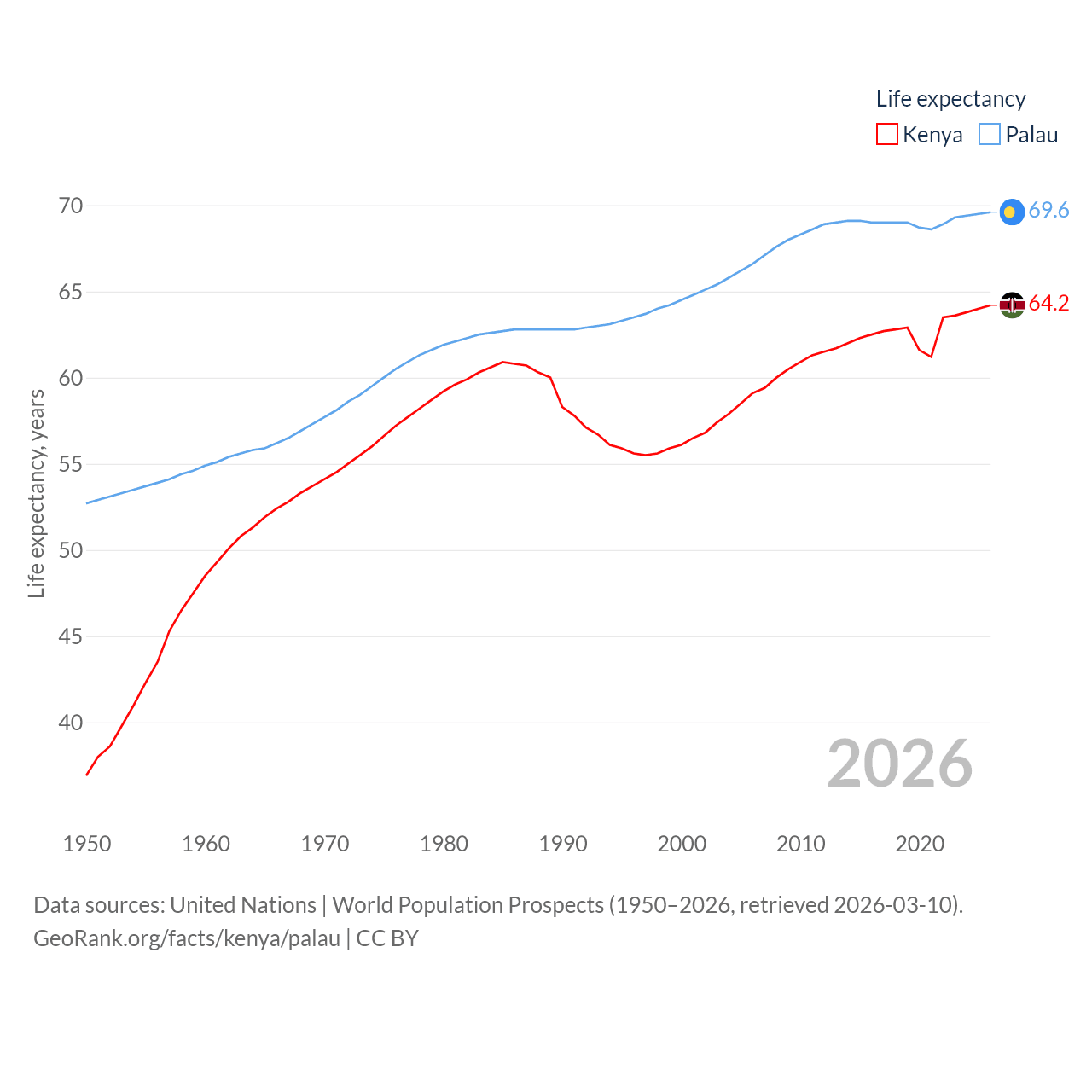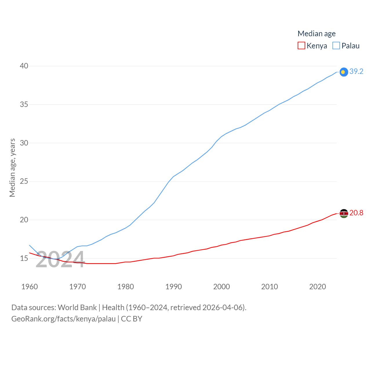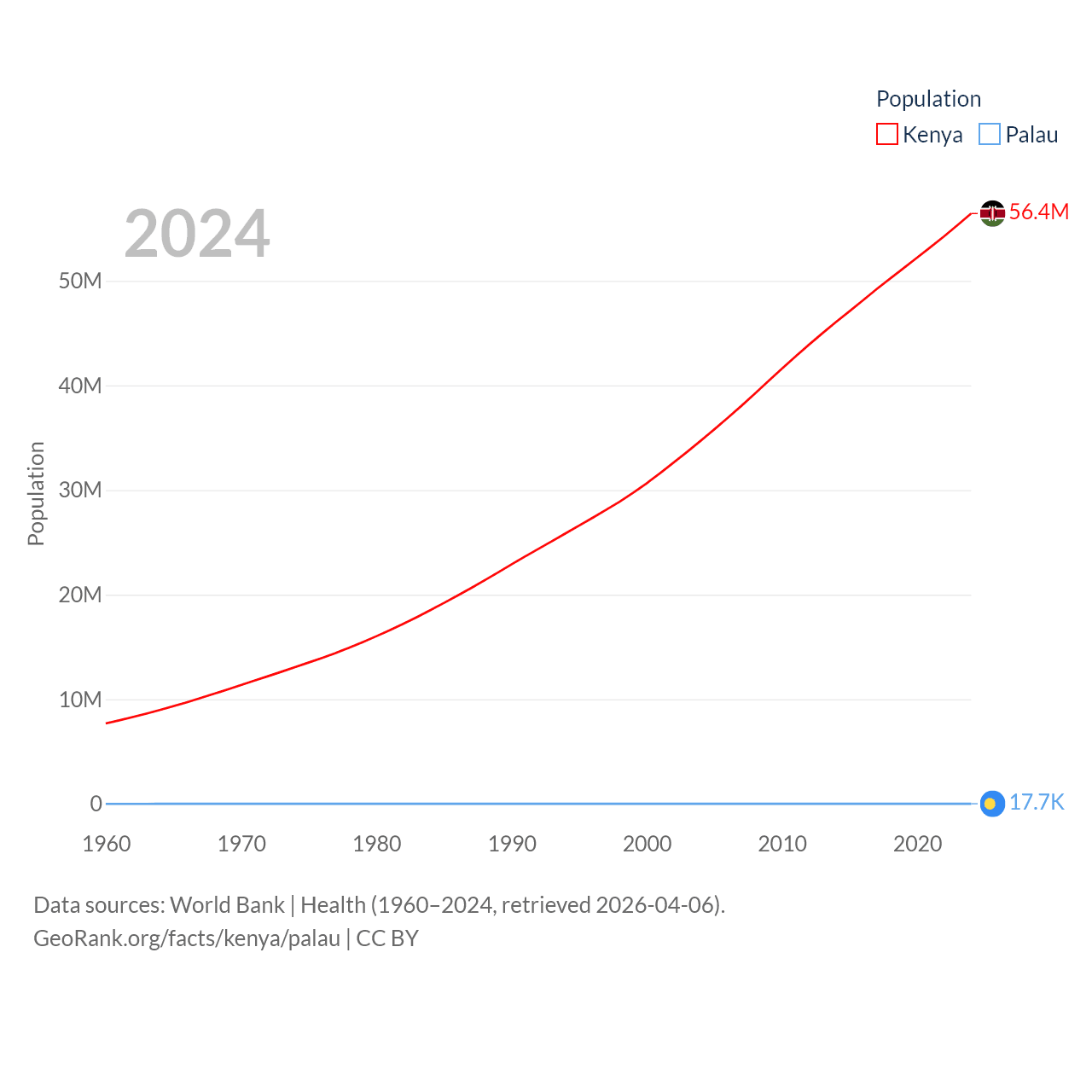 Kenya has a population of 56.4M (ranked 26/197), compared with 17.7K in Palau (ranked 194/197). Kenya's land area is 224,278 sq mi versus 177.6 sq mi for Palau (ranked 45th vs. 180th).