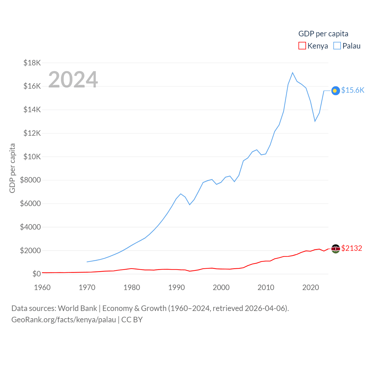 By GDP, Kenya ranks 64/197 ($120B) and Palau ranks 194/197 ($277M). By GDP per capita, Kenya ranks 154/197 ($2,132), while Palau ranks 67/197 ($15,611).