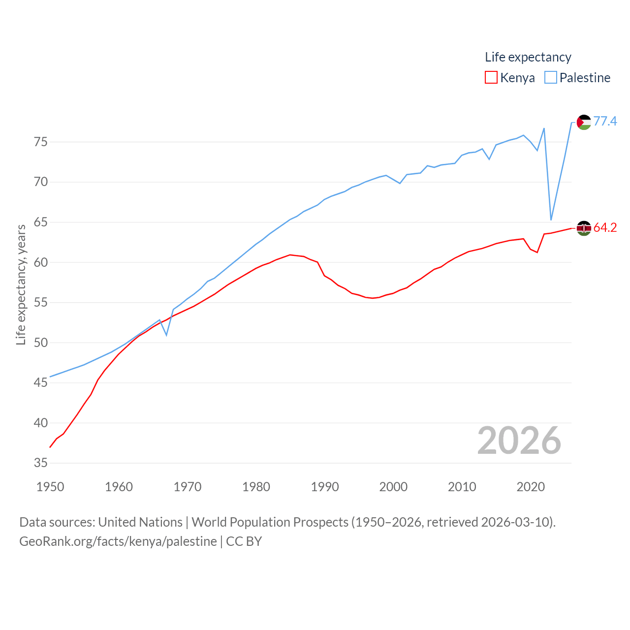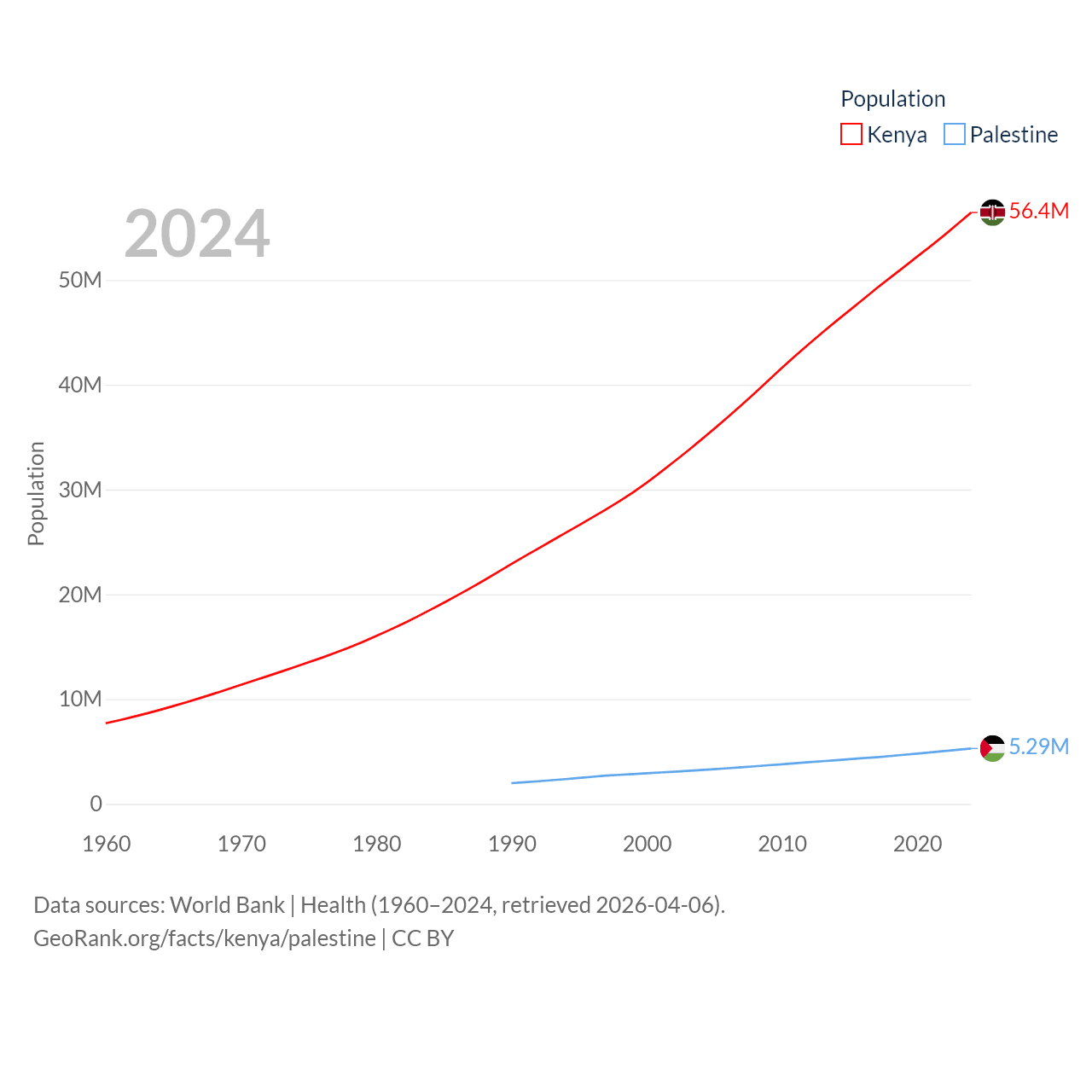 Kenya has a population of 56.4M (ranked 26/197), compared with 5.29M in Palestine (ranked 122/197). Kenya's land area is 224,278 sq mi versus 2,326 sq mi for Palestine (ranked 45th vs. 164th).