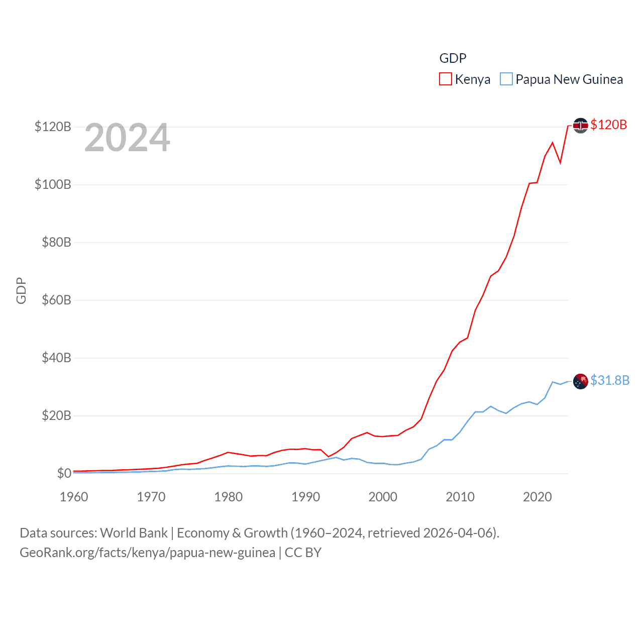 By GDP, Kenya ranks 64/197 ($120B) and Papua New Guinea ranks 110/197 ($31.8B). By GDP per capita, Kenya ranks 154/197 ($2,132), while Papua New Guinea ranks 140/197 ($3,007).
