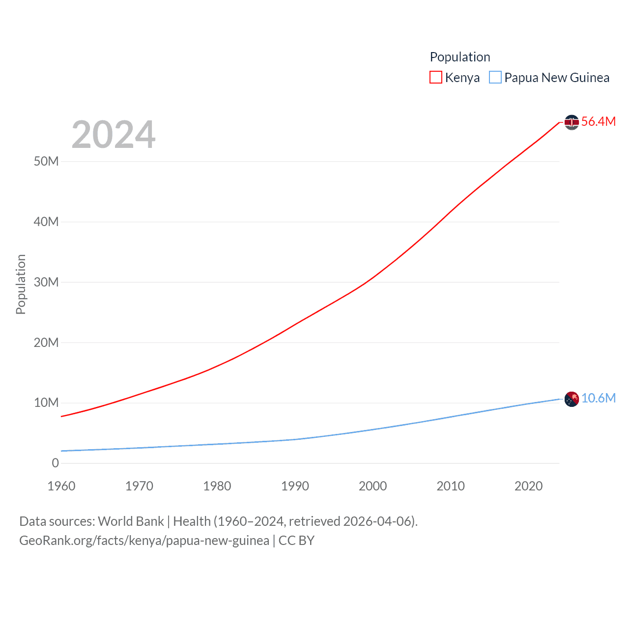 Kenya has a population of 56.4M (ranked 26/197), compared with 10.6M in Papua New Guinea (ranked 92/197). Kenya's land area is 224,278 sq mi versus 174,850 sq mi for Papua New Guinea (ranked 45th vs. 54th).