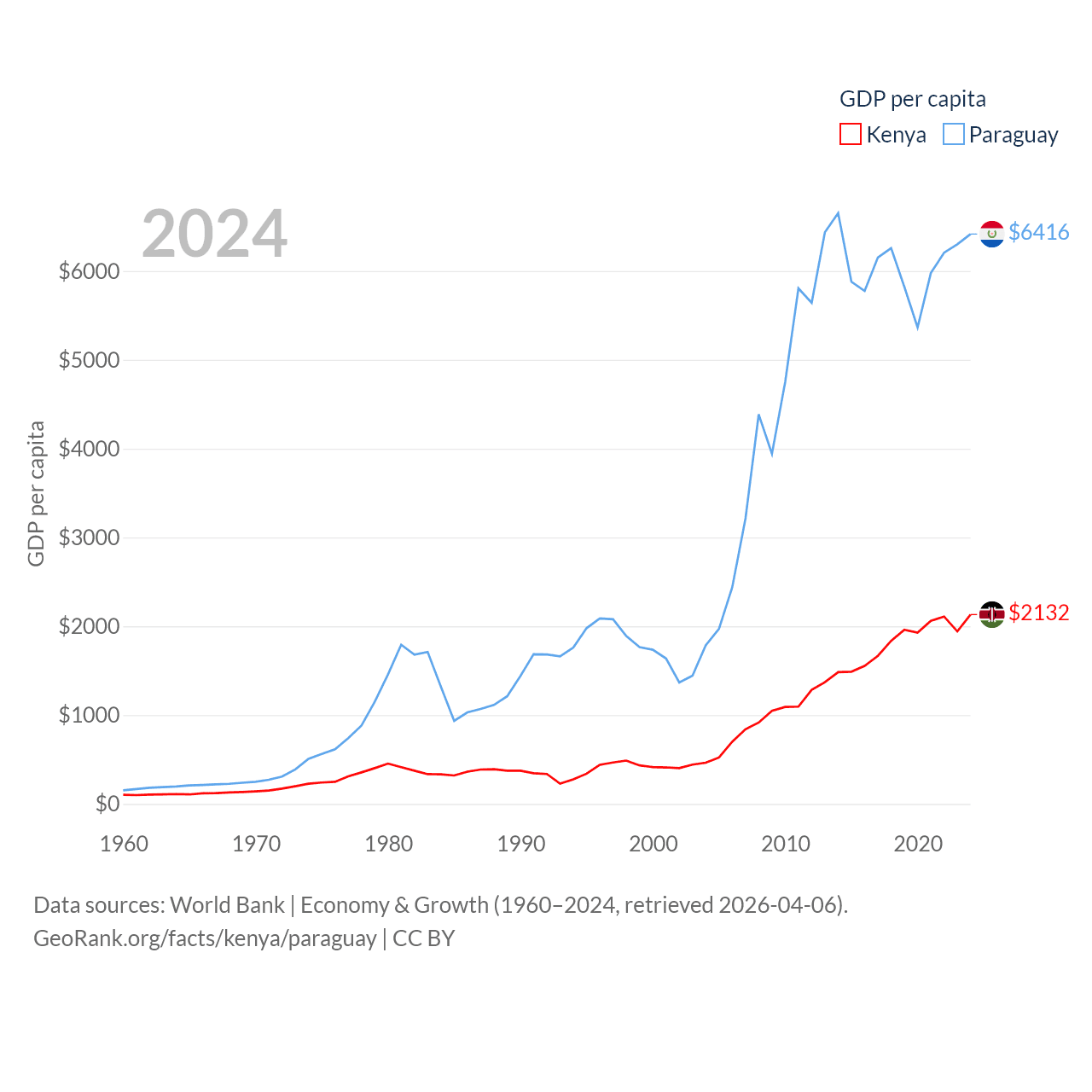 By GDP, Kenya ranks 64/197 ($120B) and Paraguay ranks 98/197 ($44.5B). By GDP per capita, Kenya ranks 154/197 ($2,132), while Paraguay ranks 109/197 ($6,416).