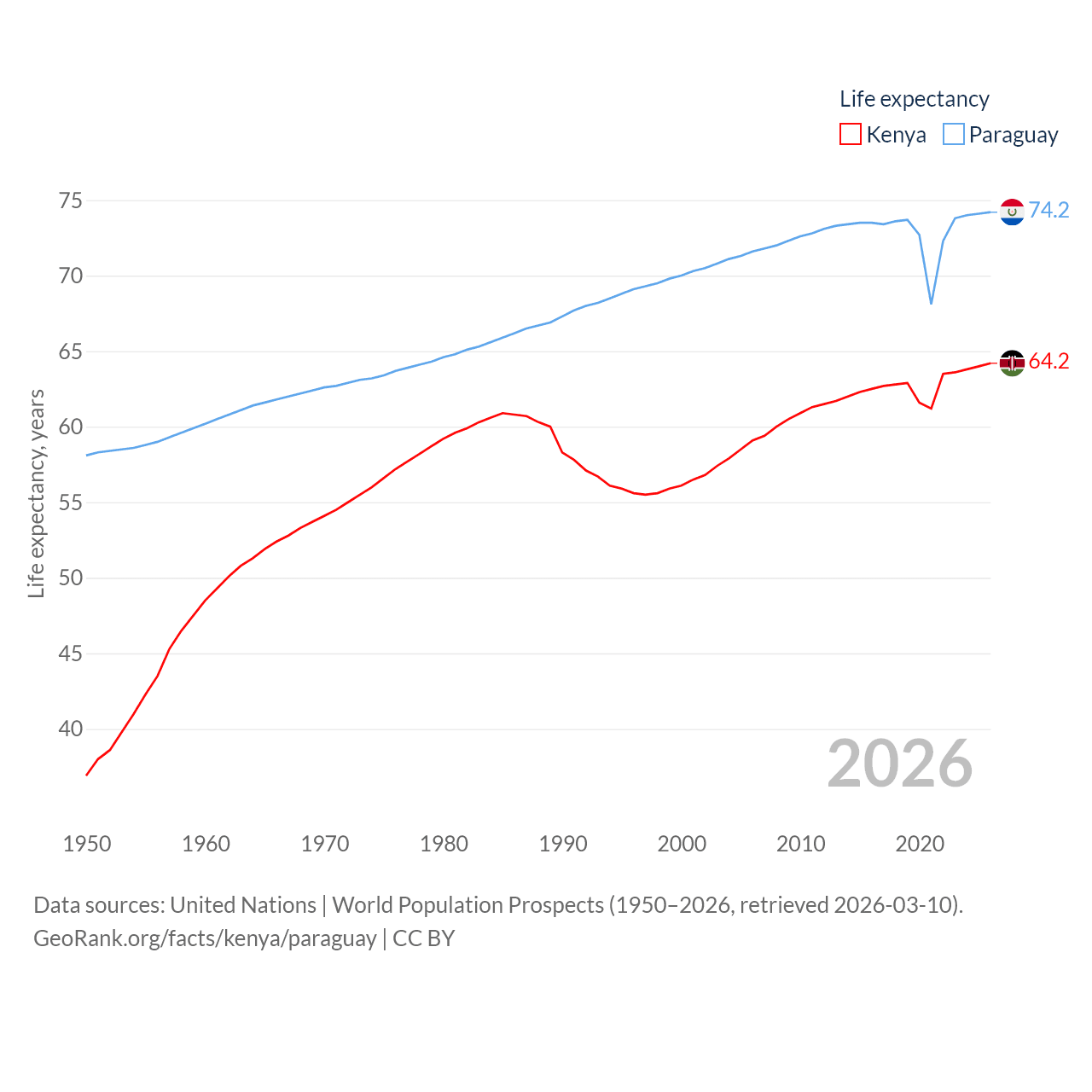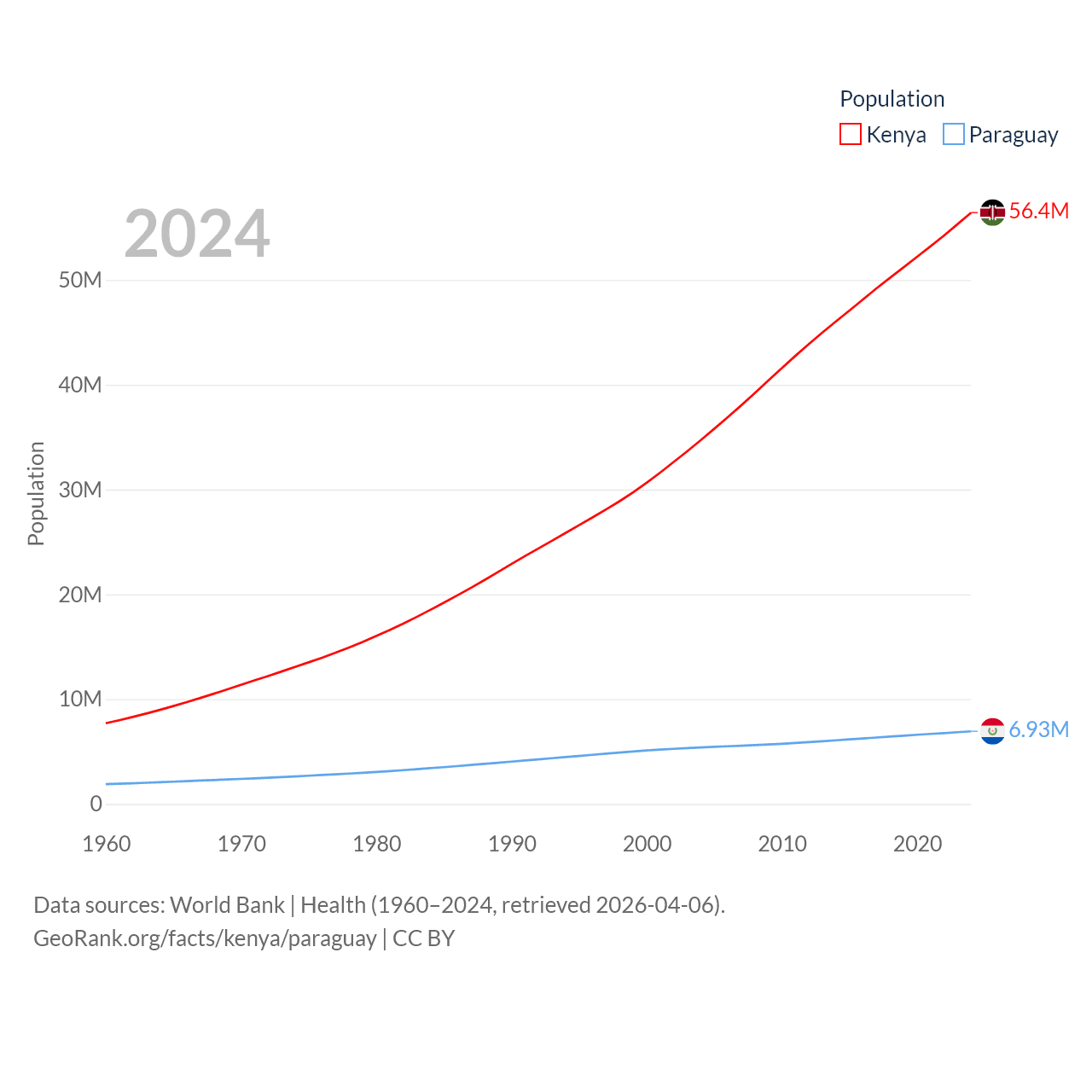 Kenya has a population of 56.4M (ranked 26/197), compared with 6.93M in Paraguay (ranked 107/197). Kenya's land area is 224,278 sq mi versus 152,901 sq mi for Paraguay (ranked 45th vs. 59th).