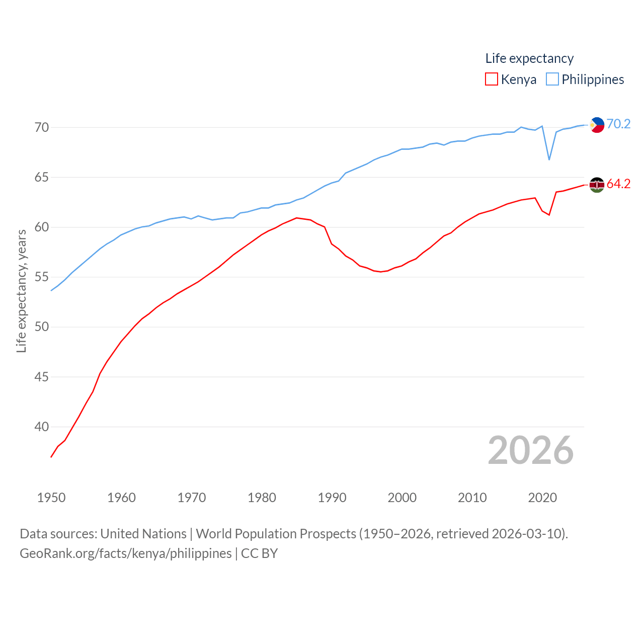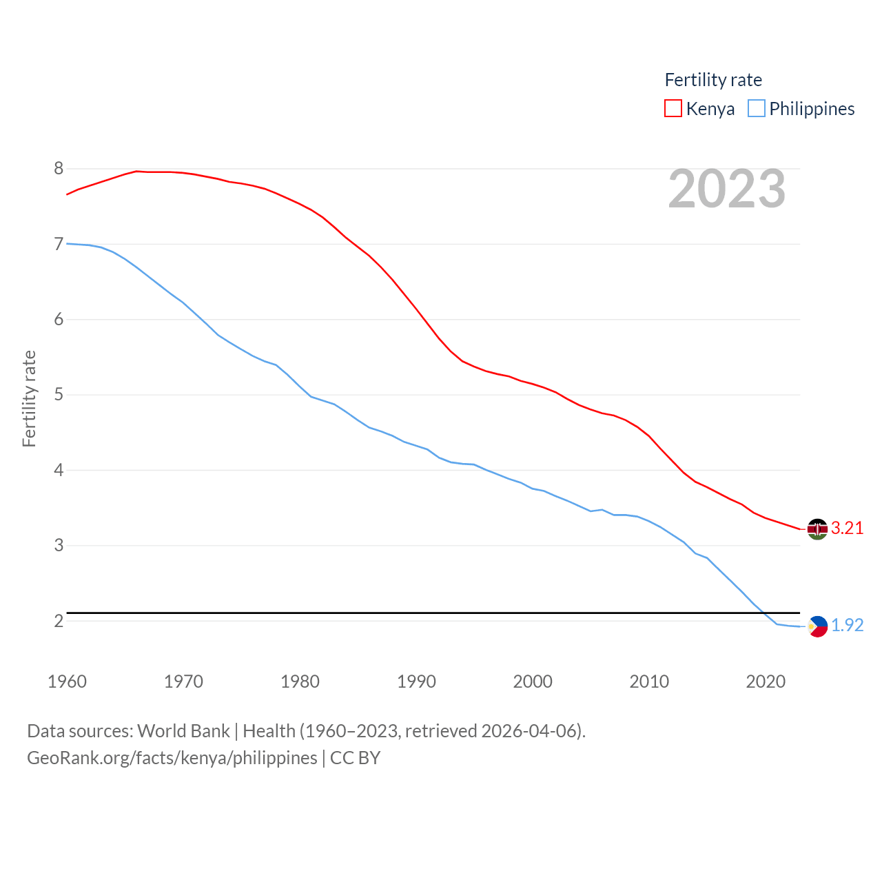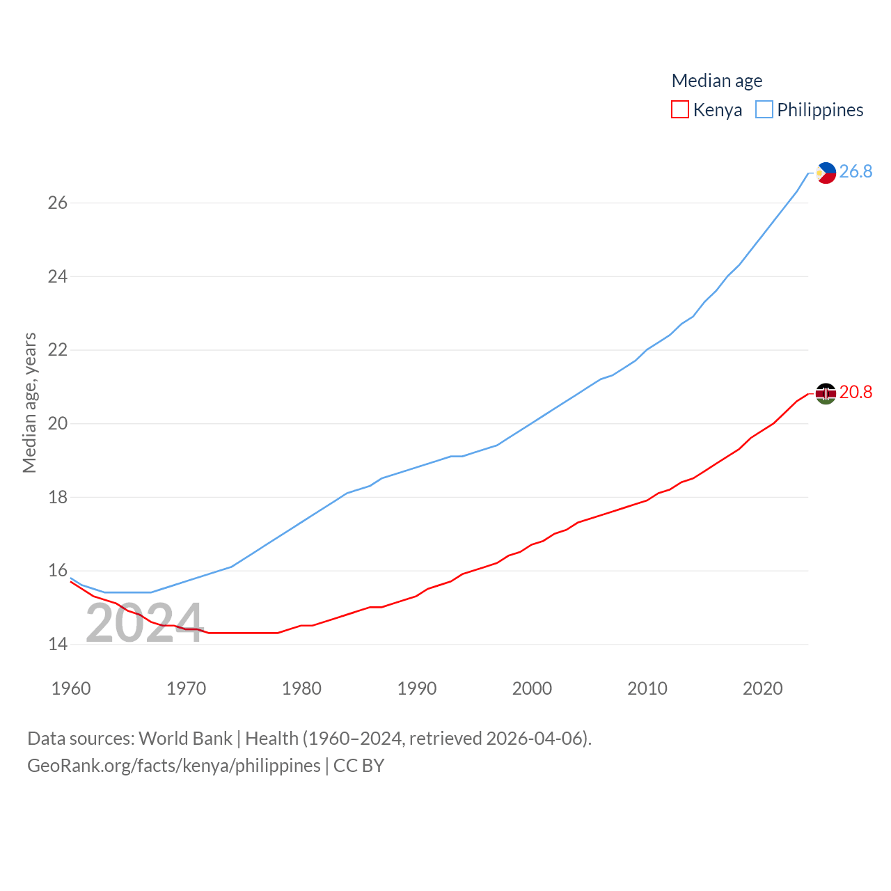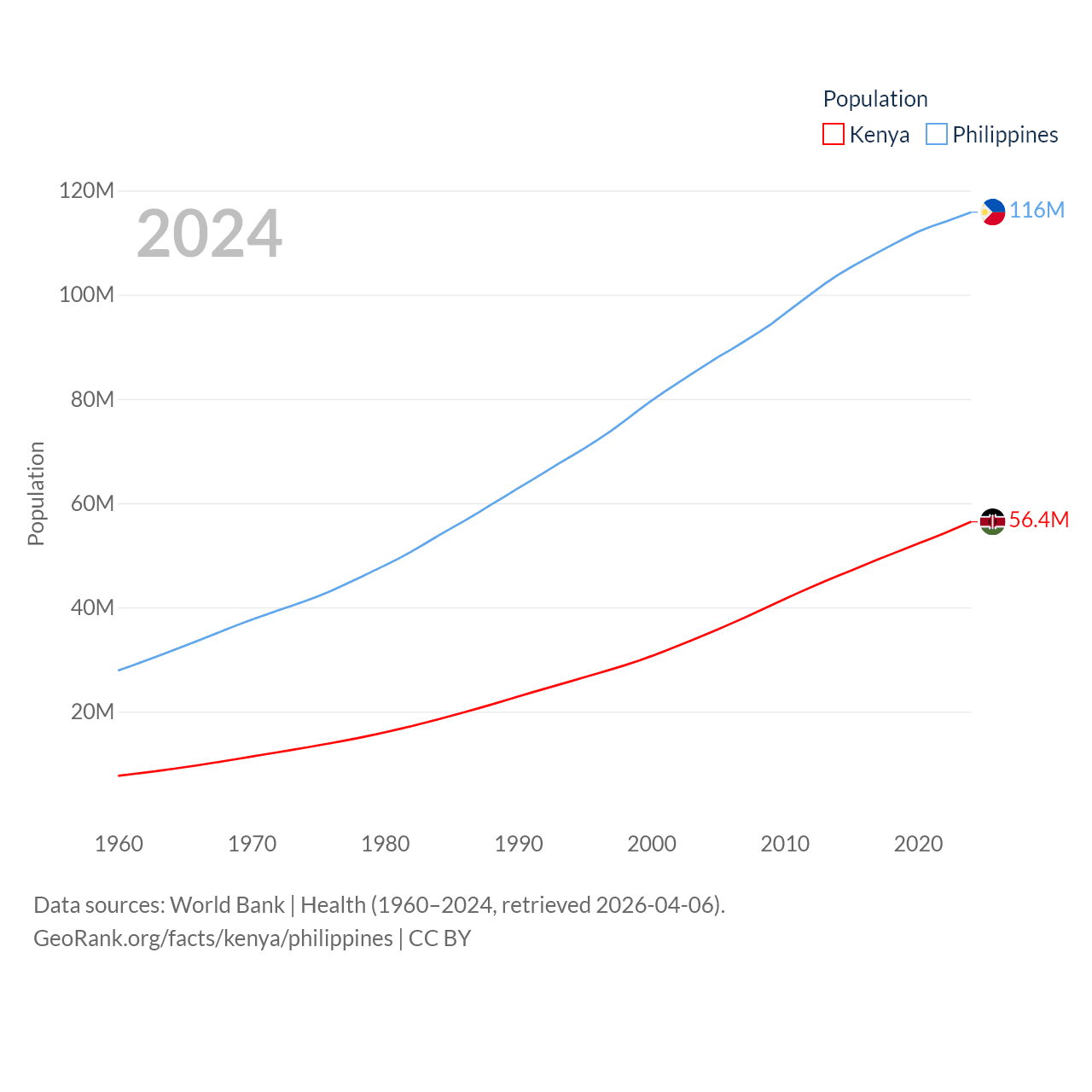 Kenya has a population of 56.4M (ranked 26/197), compared with 116M in The Philippines (ranked 14/197). Kenya's land area is 224,278 sq mi versus 115,124 sq mi for The Philippines (ranked 45th vs. 71st).