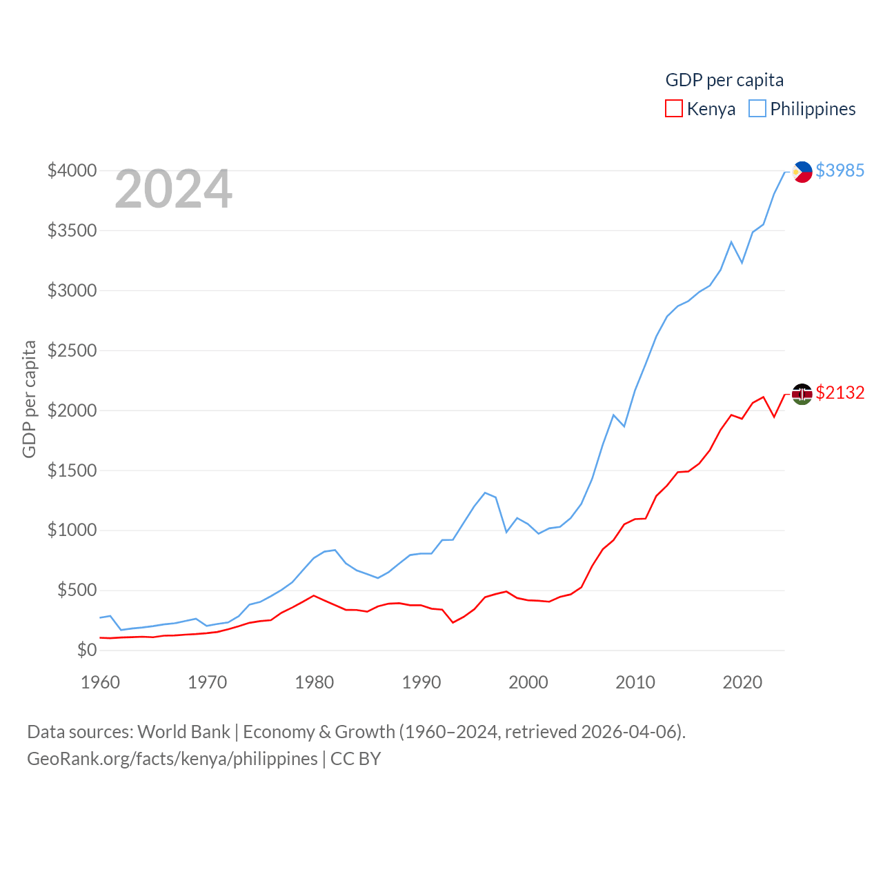 By GDP, Kenya ranks 64/197 ($120B) and The Philippines ranks 35/197 ($462B). By GDP per capita, Kenya ranks 154/197 ($2,132), while The Philippines ranks 130/197 ($3,985).