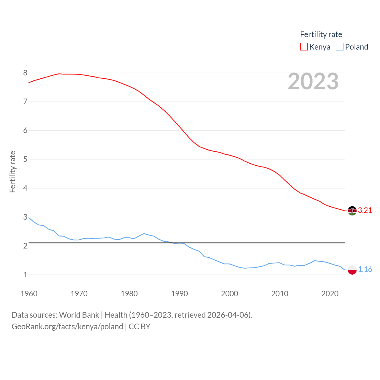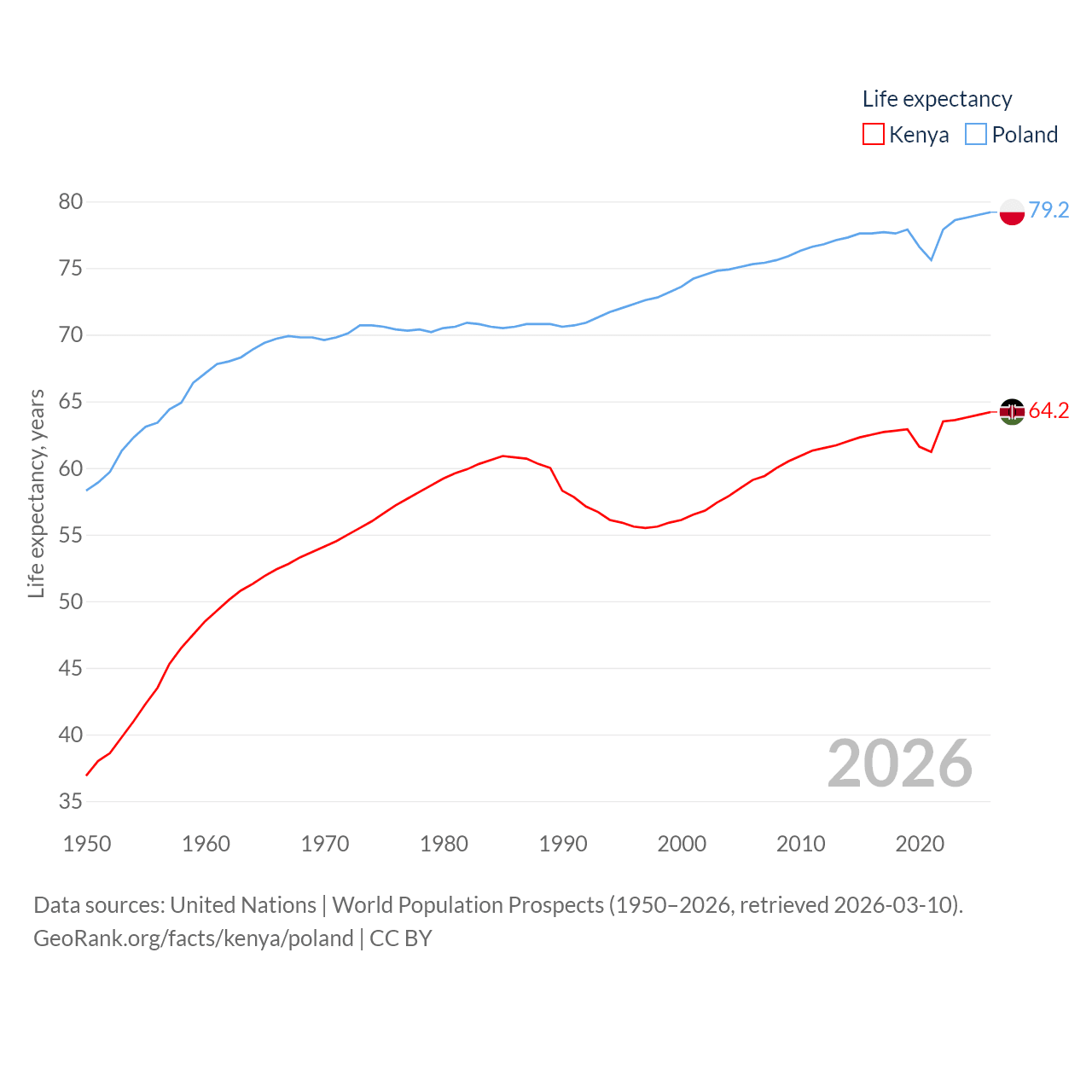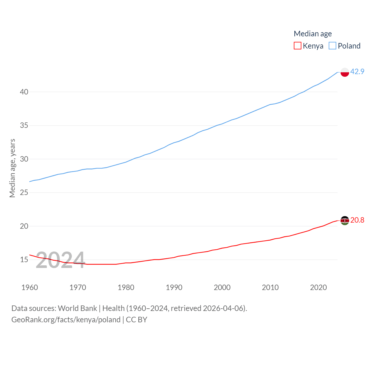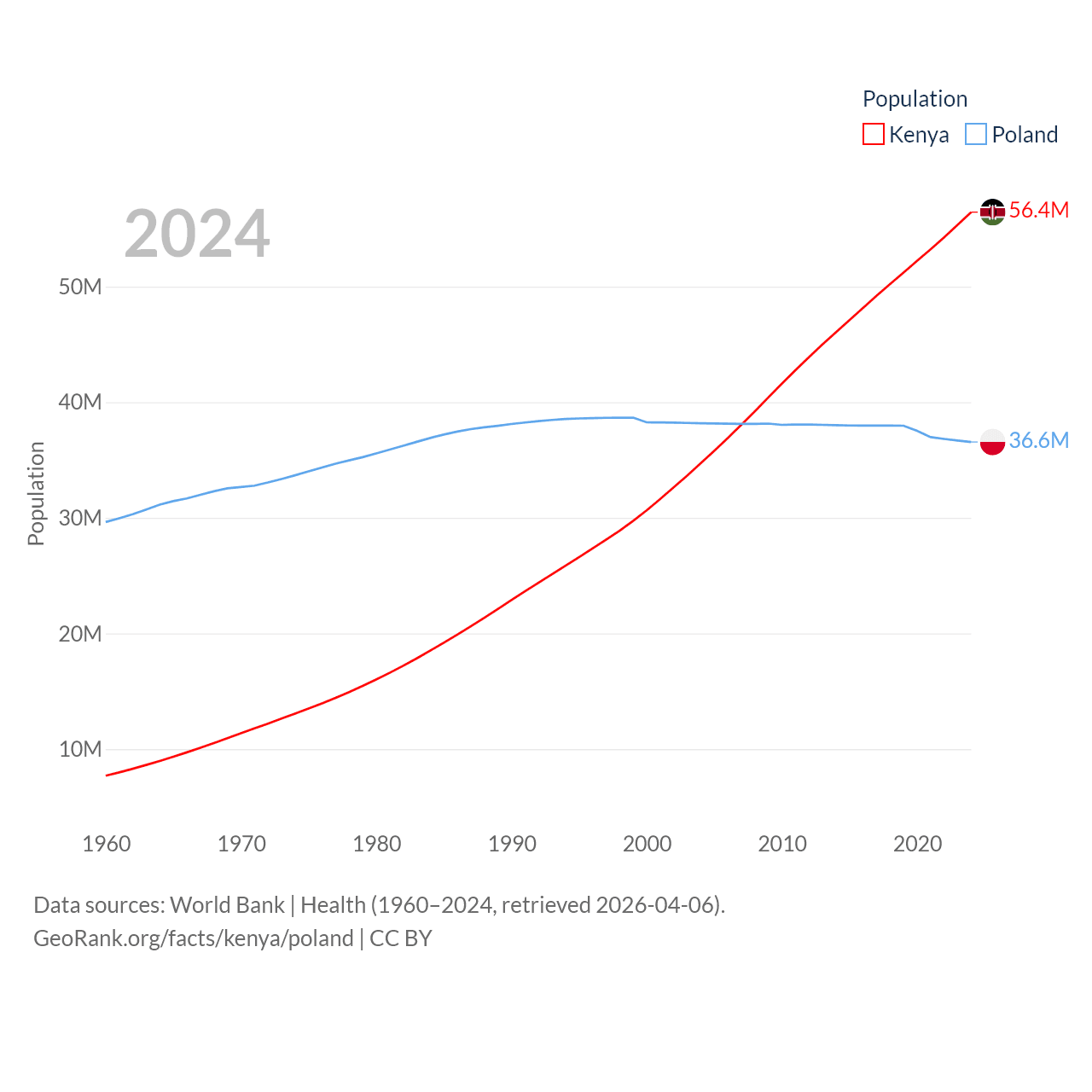 Kenya has a population of 56.4M (ranked 26/197), compared with 36.6M in Poland (ranked 42/197). Kenya's land area is 224,278 sq mi versus 118,252 sq mi for Poland (ranked 45th vs. 69th).