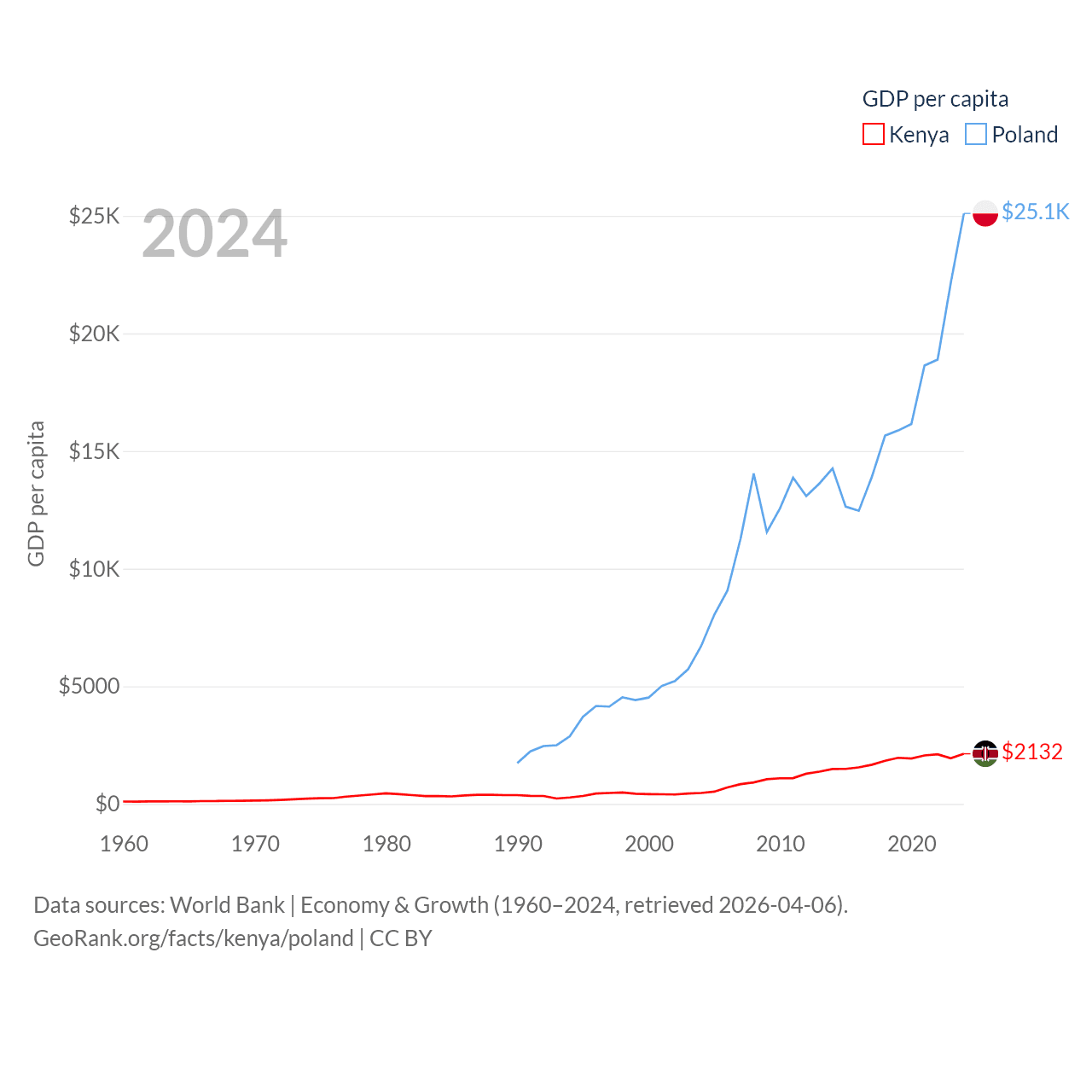 By GDP, Kenya ranks 64/197 ($120B) and Poland ranks 21/197 ($918B). By GDP per capita, Kenya ranks 154/197 ($2,132), while Poland ranks 48/197 ($25,104).