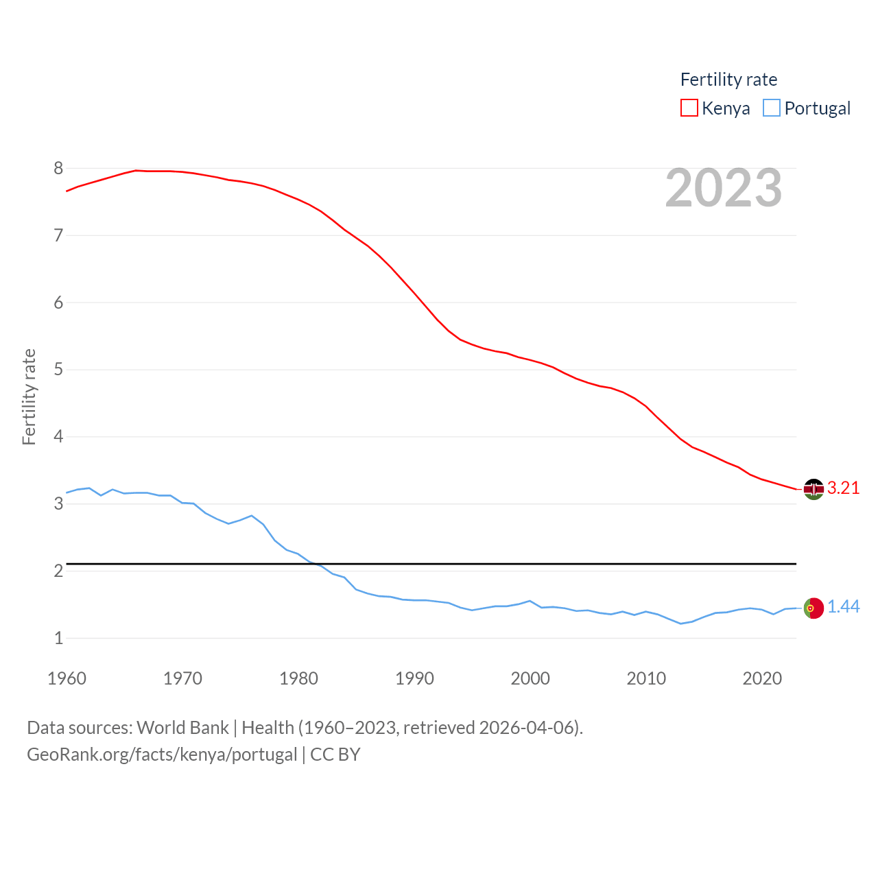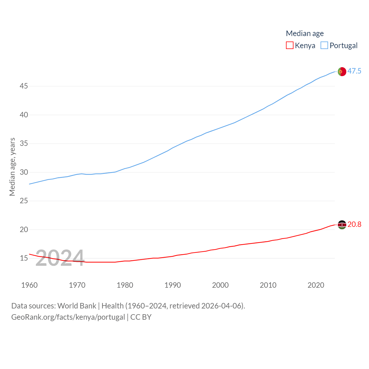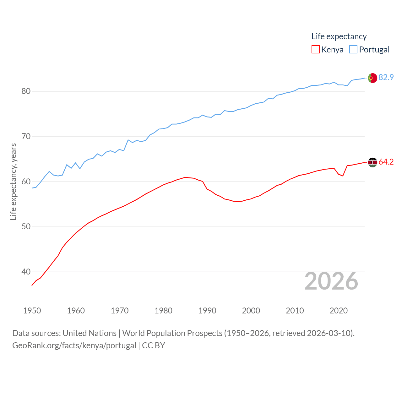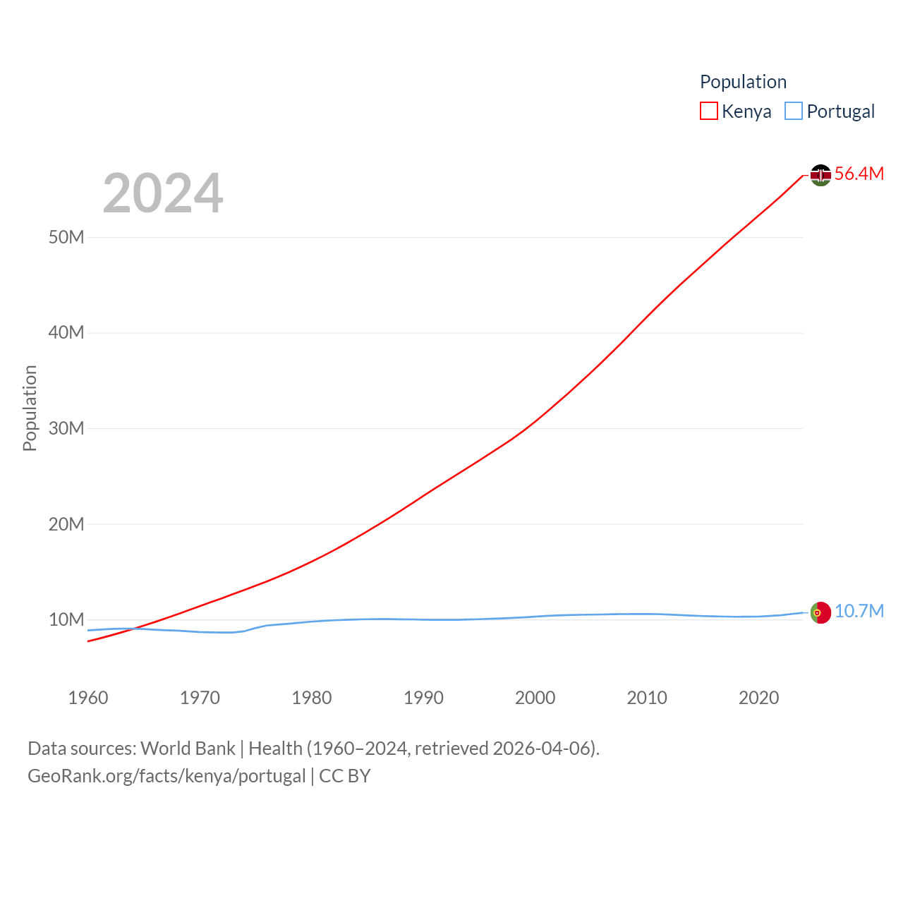 Kenya has a population of 56.4M (ranked 26/197), compared with 10.7M in Portugal (ranked 90/197). Kenya's land area is 224,278 sq mi versus 35,369 sq mi for Portugal (ranked 45th vs. 108th).