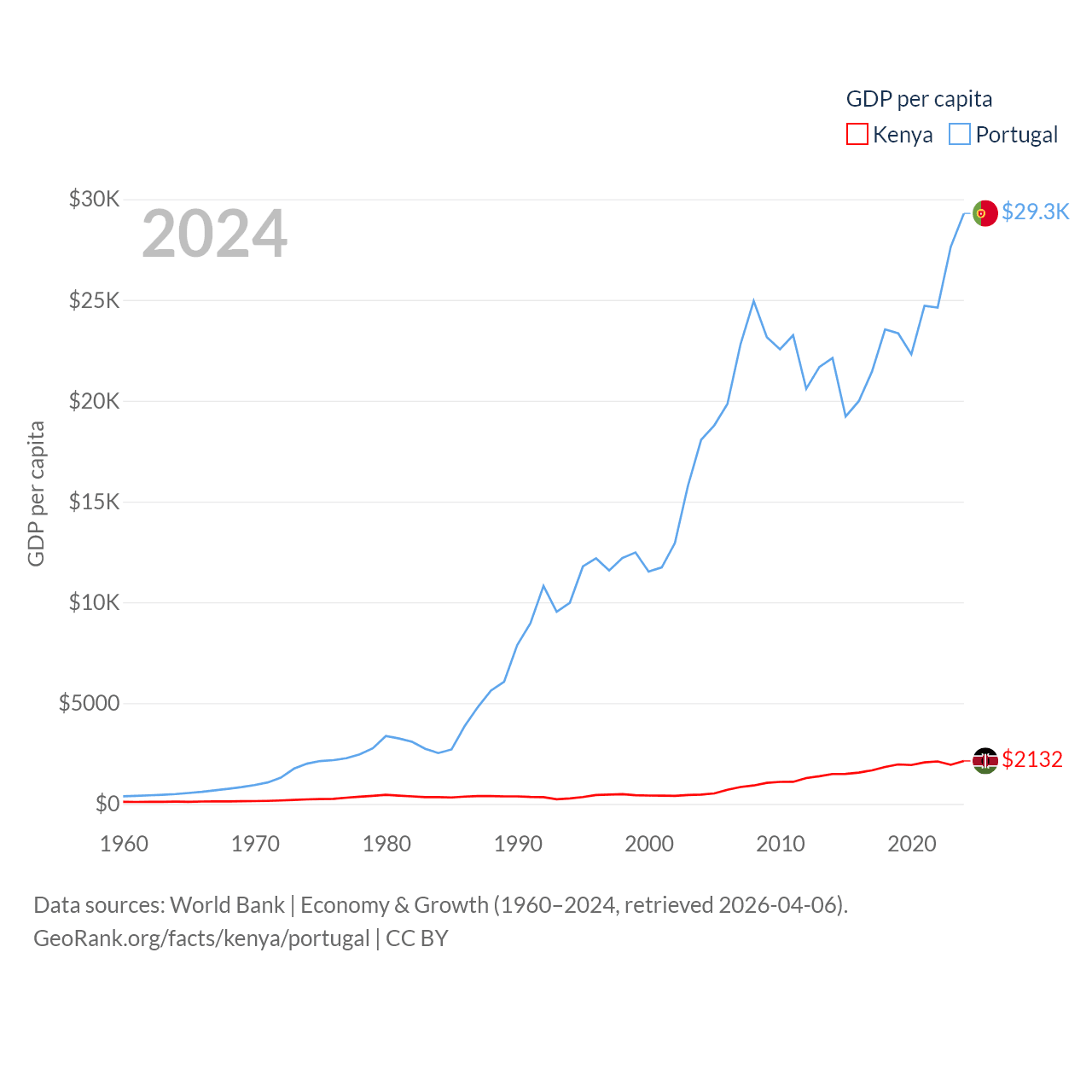 By GDP, Kenya ranks 64/197 ($120B) and Portugal ranks 46/197 ($313B). By GDP per capita, Kenya ranks 154/197 ($2,132), while Portugal ranks 44/197 ($29,292).