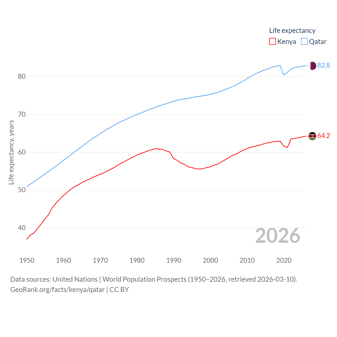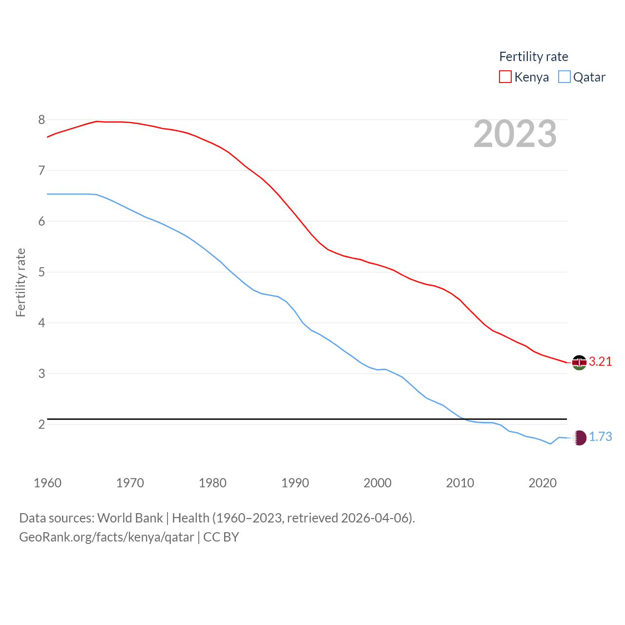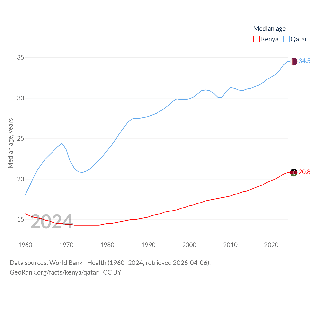 Kenya has a population of 56.4M (ranked 26/197), compared with 2.86M in Qatar (ranked 138/197). Kenya's land area is 224,278 sq mi versus 4,436 sq mi for Qatar (ranked 45th vs. 158th).