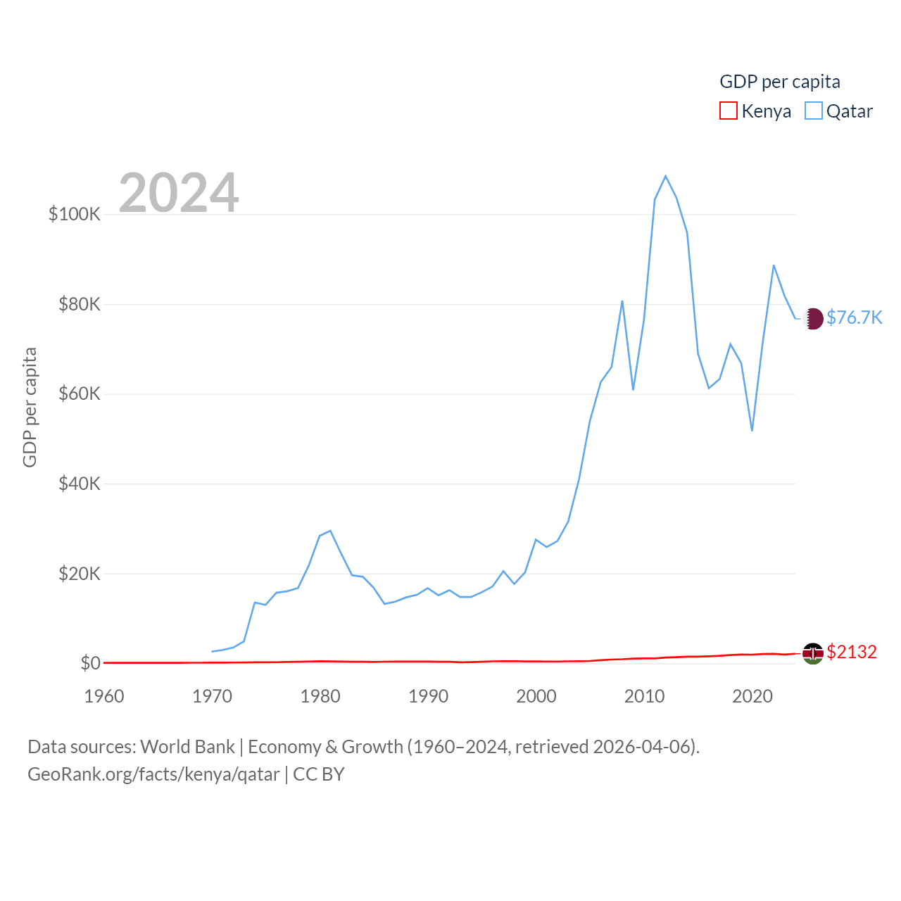 By GDP, Kenya ranks 64/197 ($120B) and Qatar ranks 56/197 ($219B). By GDP per capita, Kenya ranks 154/197 ($2,132), while Qatar ranks 11/197 ($76,689).
