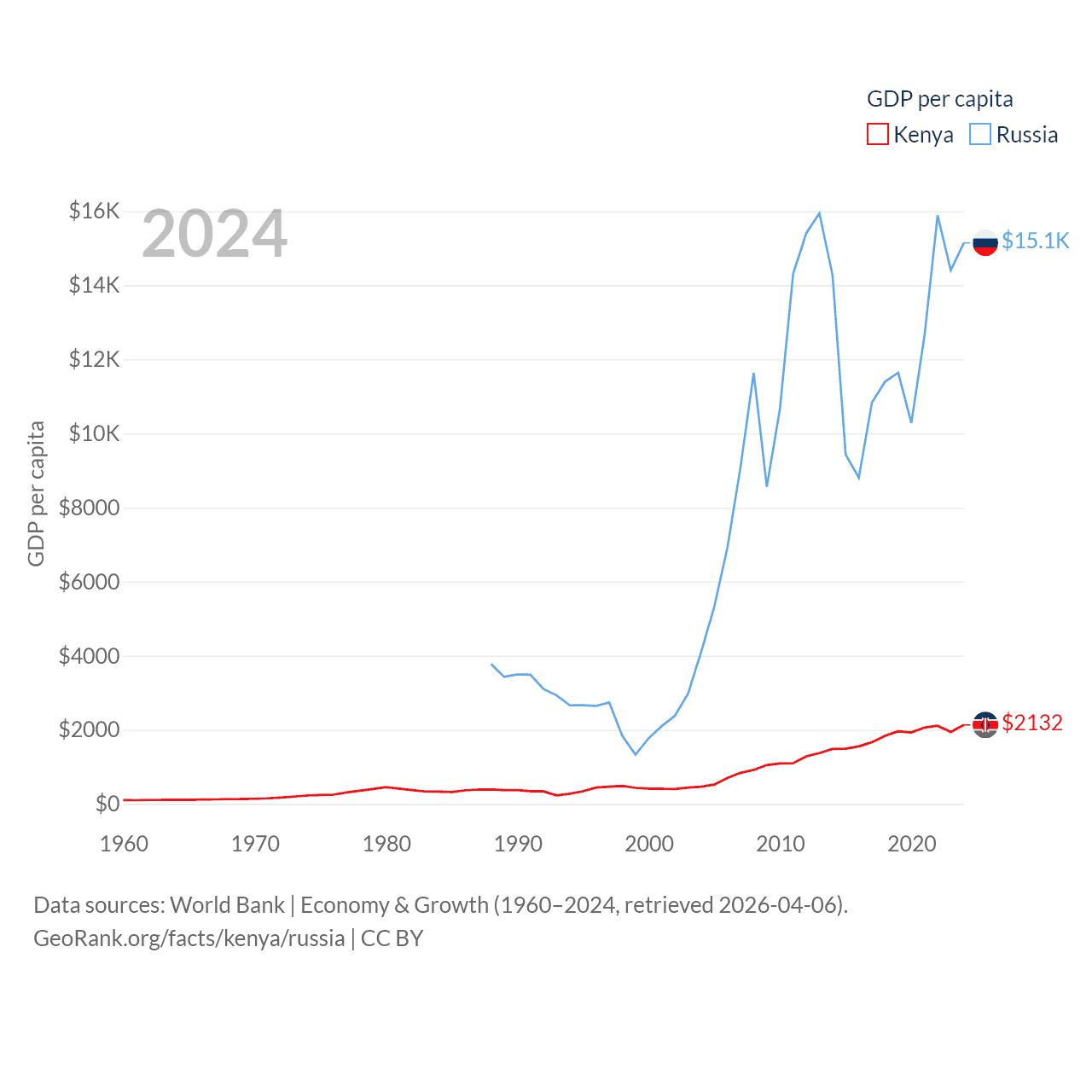By GDP, Kenya ranks 64/197 ($120B) and Russia ranks 11/197 ($2.17T). By GDP per capita, Kenya ranks 154/197 ($2,132), while Russia ranks 68/197 ($15,145).