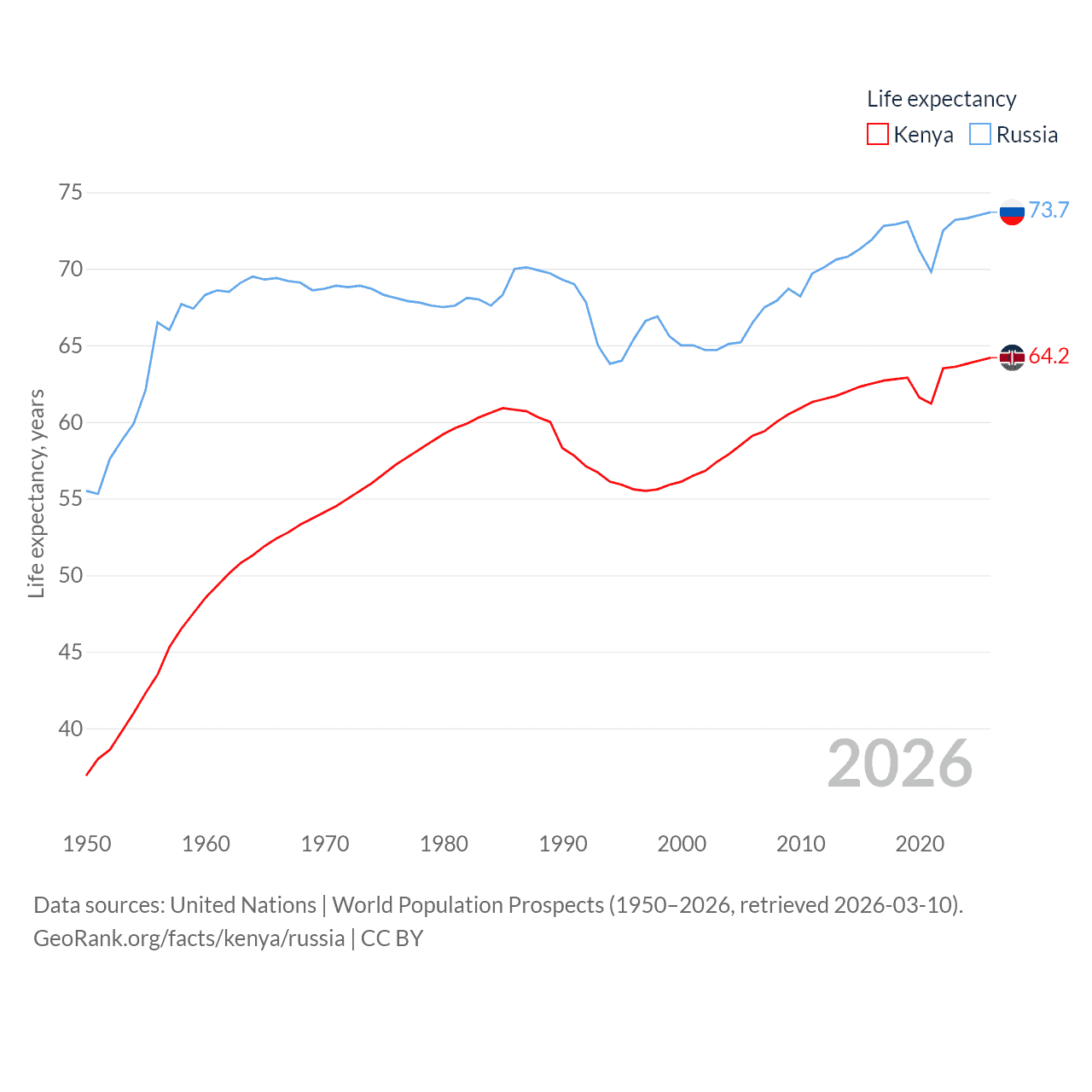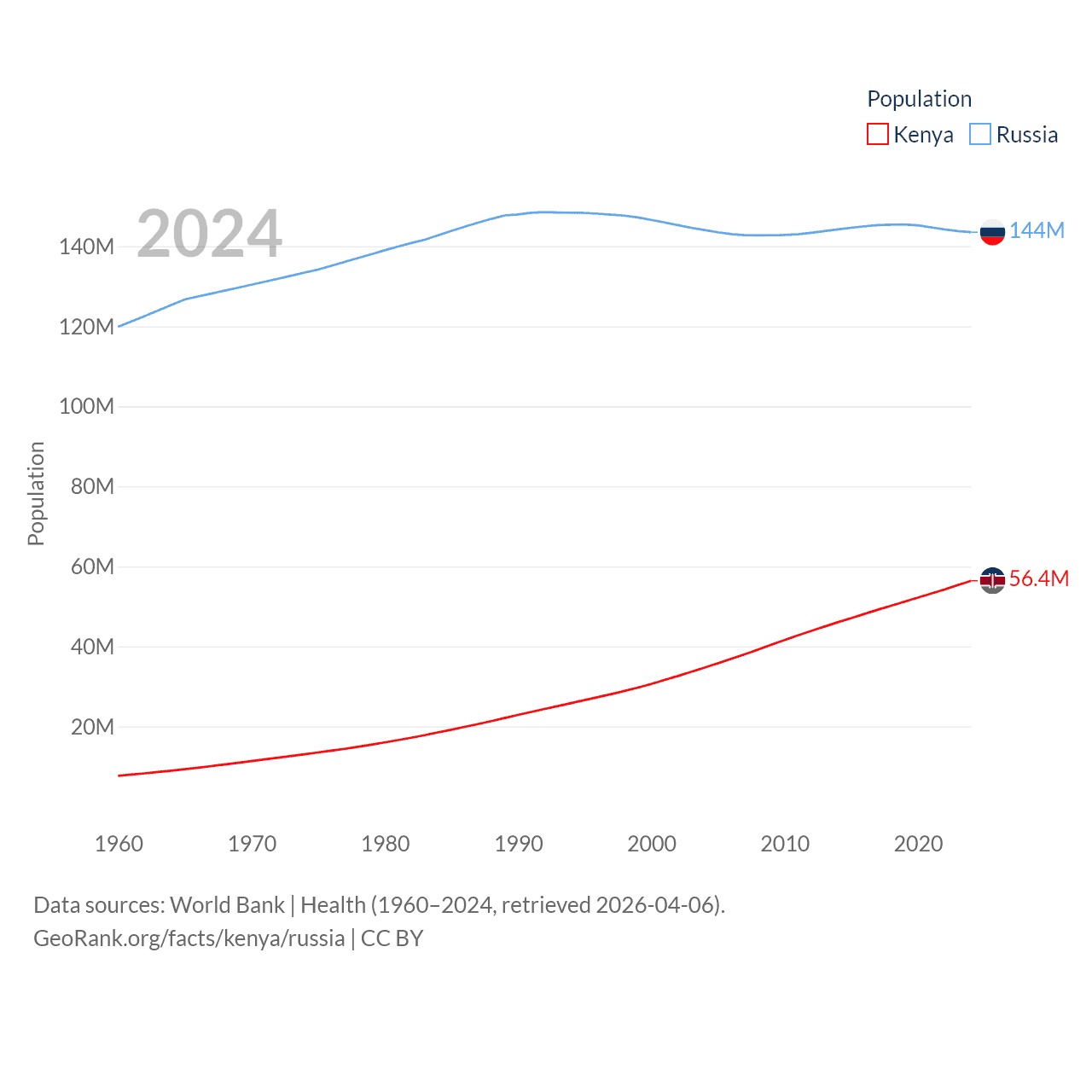 Kenya has a population of 56.4M (ranked 26/197), compared with 144M in Russia (ranked 9/197). Kenya's land area is 224,278 sq mi versus 6,323,145 sq mi for Russia (ranked 45th vs. 1st).