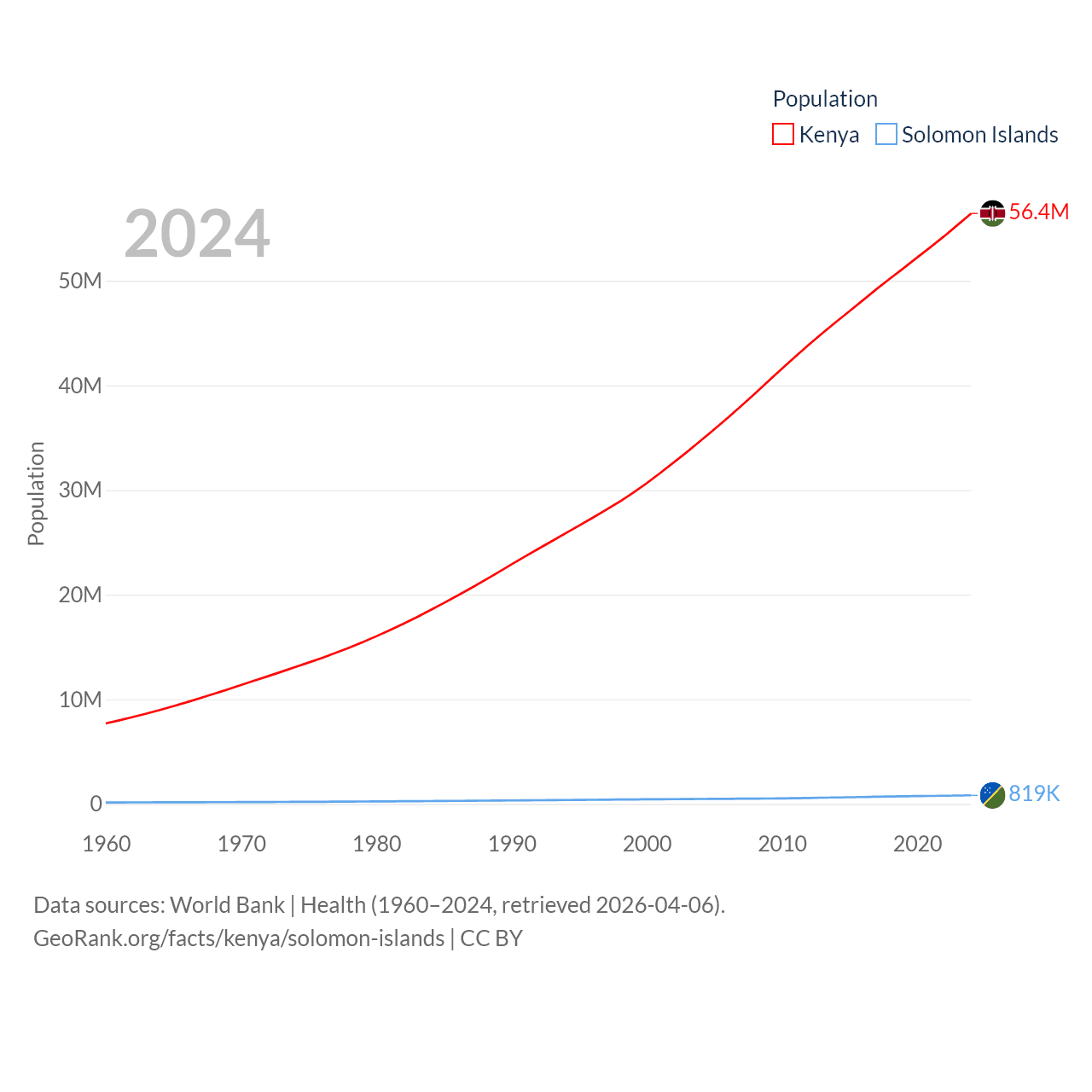 Kenya has a population of 56.4M (ranked 26/197), compared with 819K in The Solomon Islands (ranked 162/197). Kenya's land area is 224,278 sq mi versus 10,807 sq mi for The Solomon Islands (ranked 45th vs. 141st).