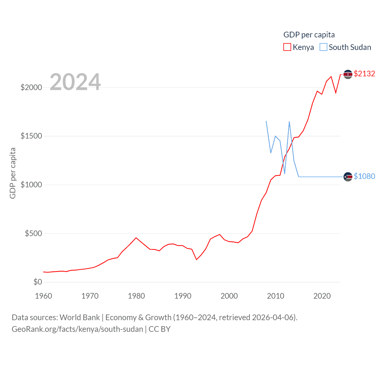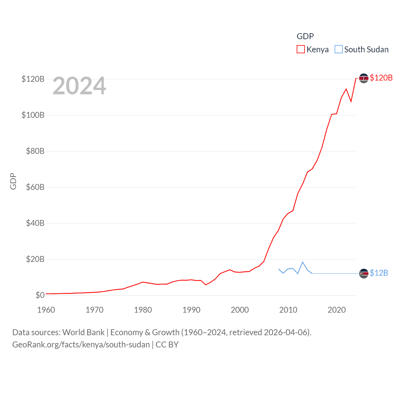 By GDP, Kenya ranks 64/197 ($120B) and South Sudan ranks 149/197 ($12B). By GDP per capita, Kenya ranks 154/197 ($2,132), while South Sudan ranks 175/197 ($1,080).