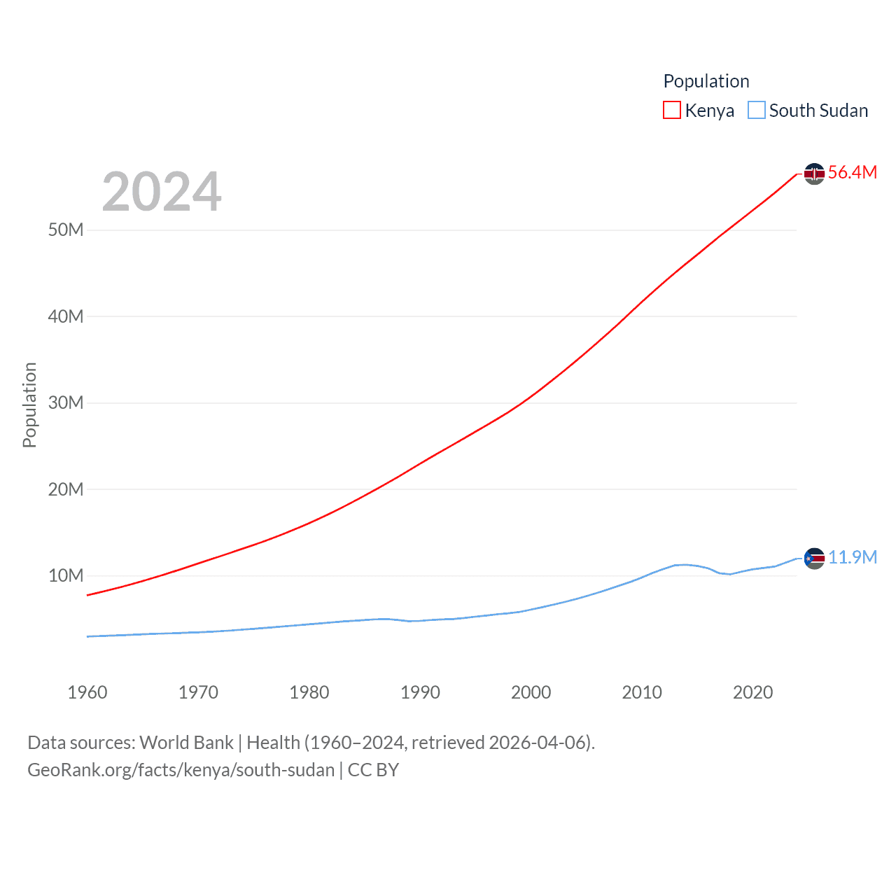 Kenya has a population of 56.4M (ranked 26/197), compared with 11.9M in South Sudan (ranked 81/197). Kenya's land area is 224,278 sq mi versus 243,990 sq mi for South Sudan (ranked 45th vs. 41st).