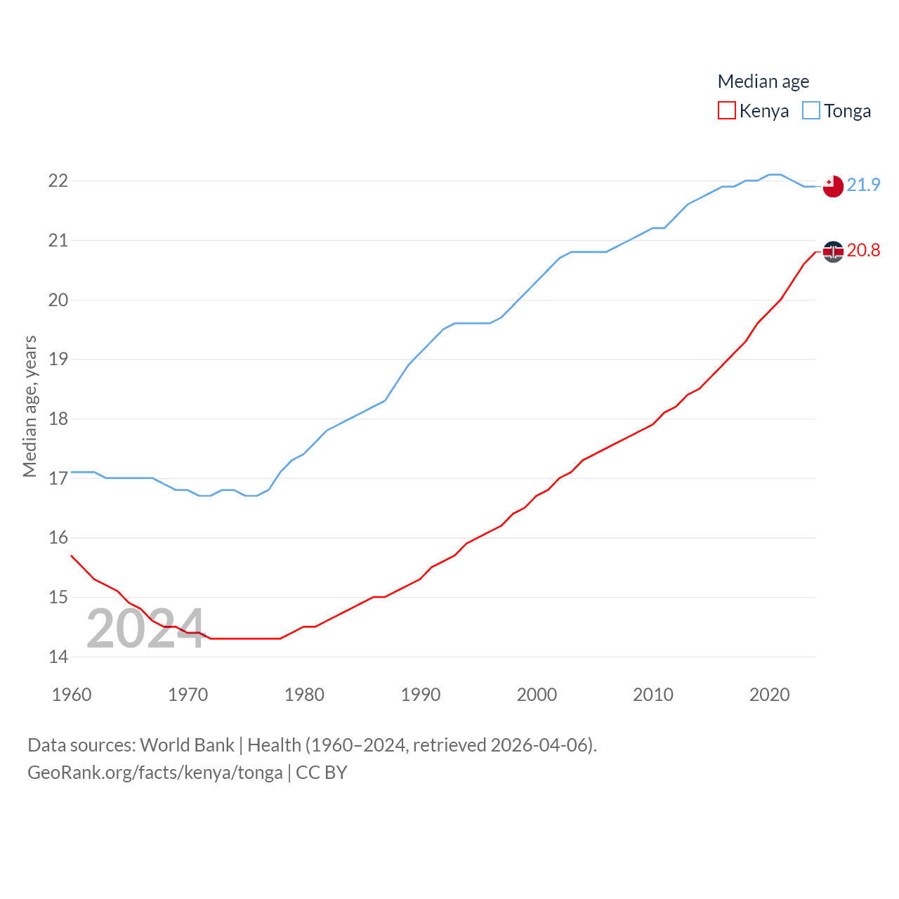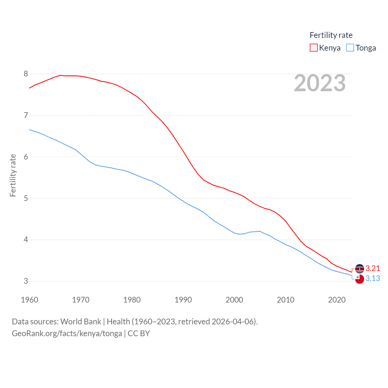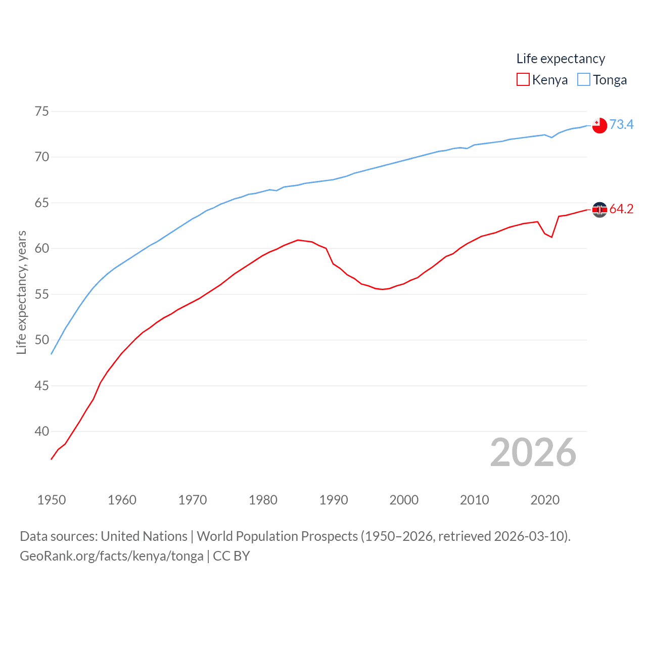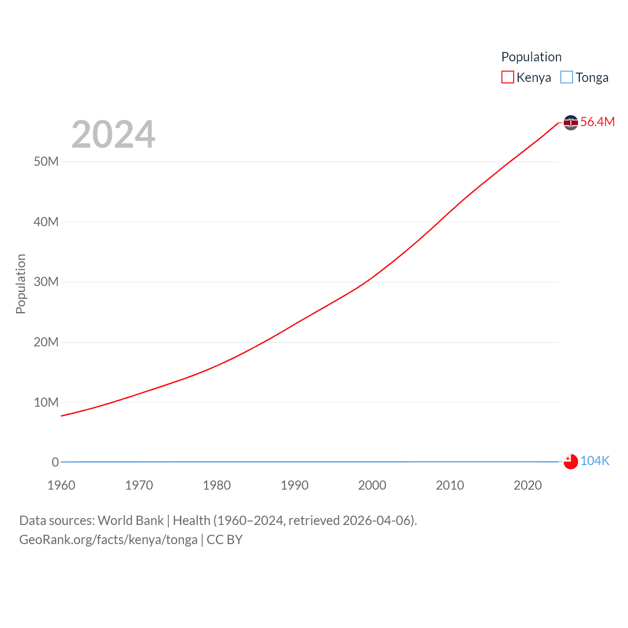 Kenya has a population of 56.4M (ranked 26/197), compared with 104K in Tonga (ranked 183/197). Kenya's land area is 224,278 sq mi versus 278 sq mi for Tonga (ranked 45th vs. 176th).