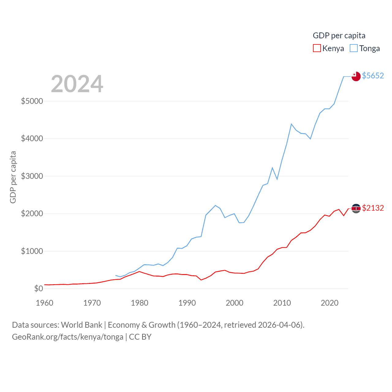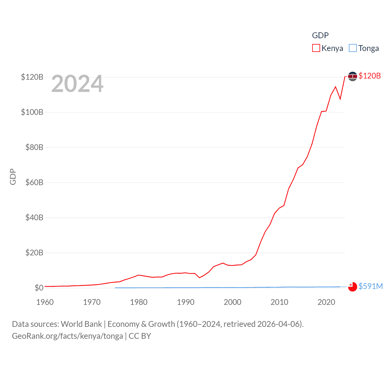 By GDP, Kenya ranks 64/197 ($120B) and Tonga ranks 191/197 ($591M). By GDP per capita, Kenya ranks 154/197 ($2,132), while Tonga ranks 115/197 ($5,652).