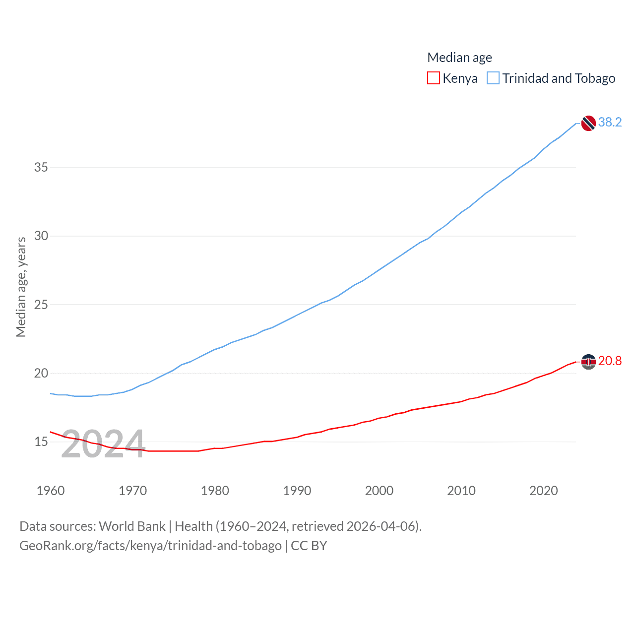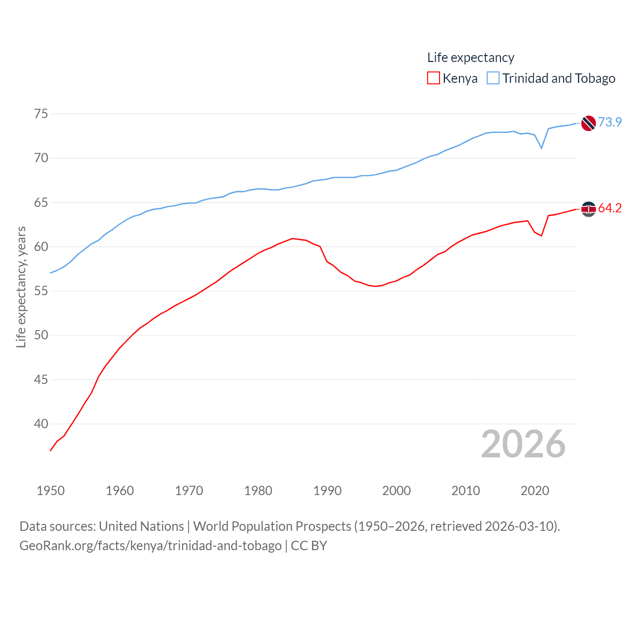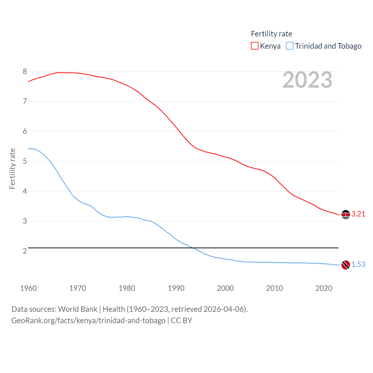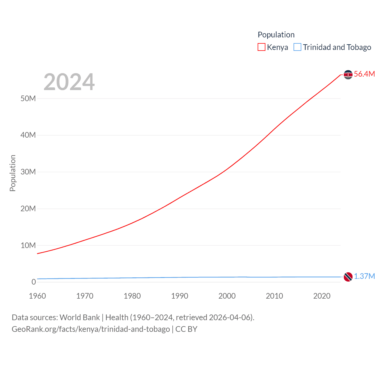 Kenya has a population of 56.4M (ranked 26/197), compared with 1.37M in Trinidad and Tobago (ranked 154/197). Kenya's land area is 224,278 sq mi versus 1,981 sq mi for Trinidad and Tobago (ranked 45th vs. 166th).