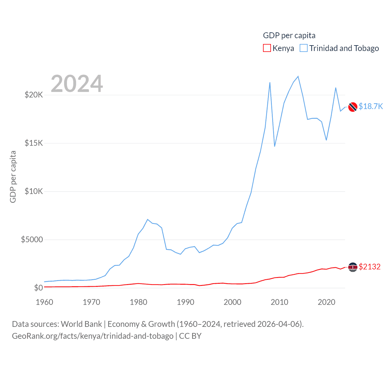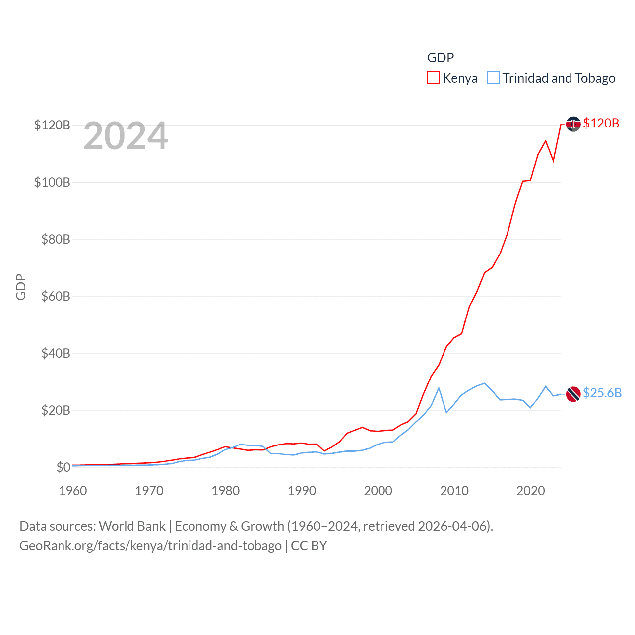 By GDP, Kenya ranks 64/197 ($120B) and Trinidad and Tobago ranks 115/197 ($25.6B). By GDP per capita, Kenya ranks 154/197 ($2,132), while Trinidad and Tobago ranks 61/197 ($18,733).