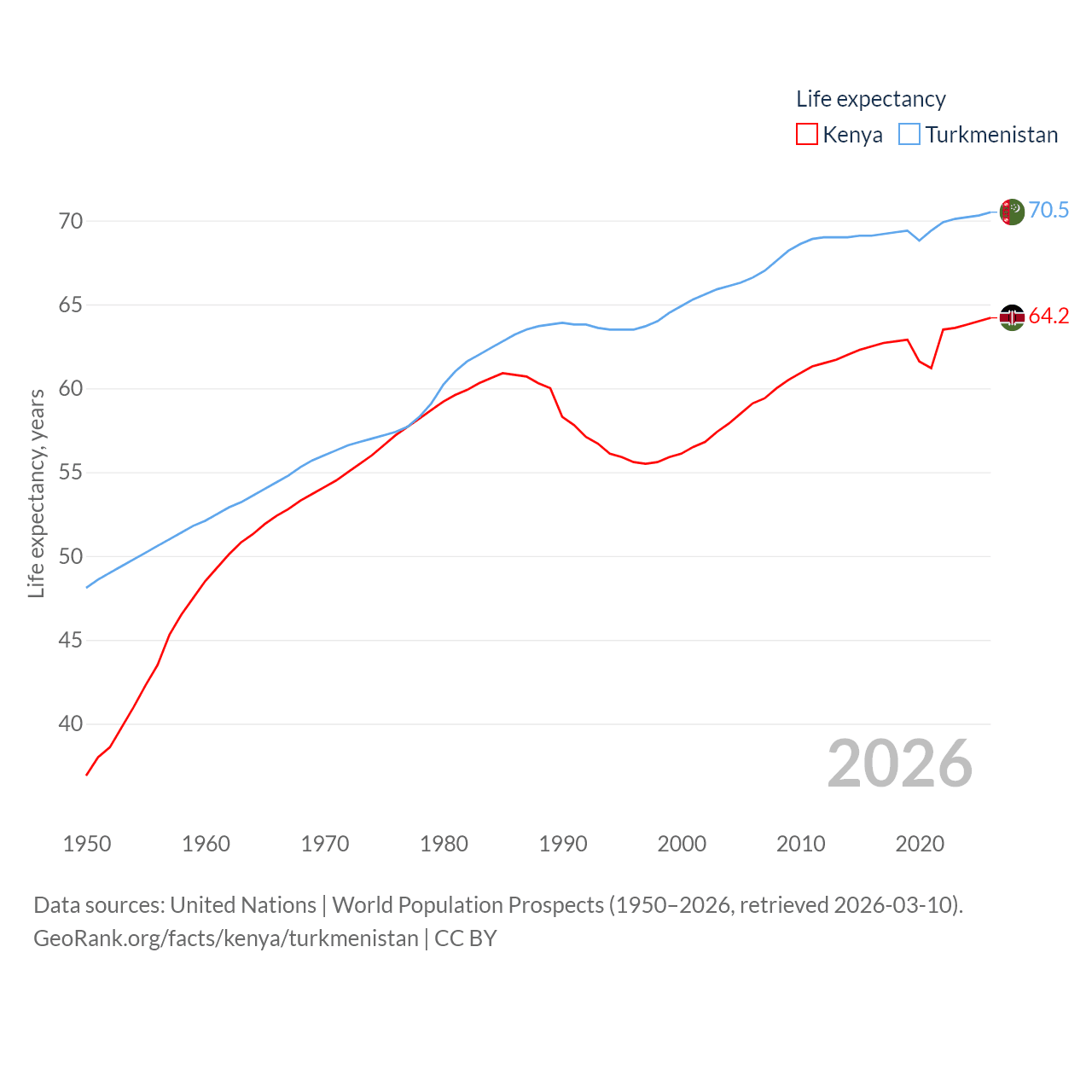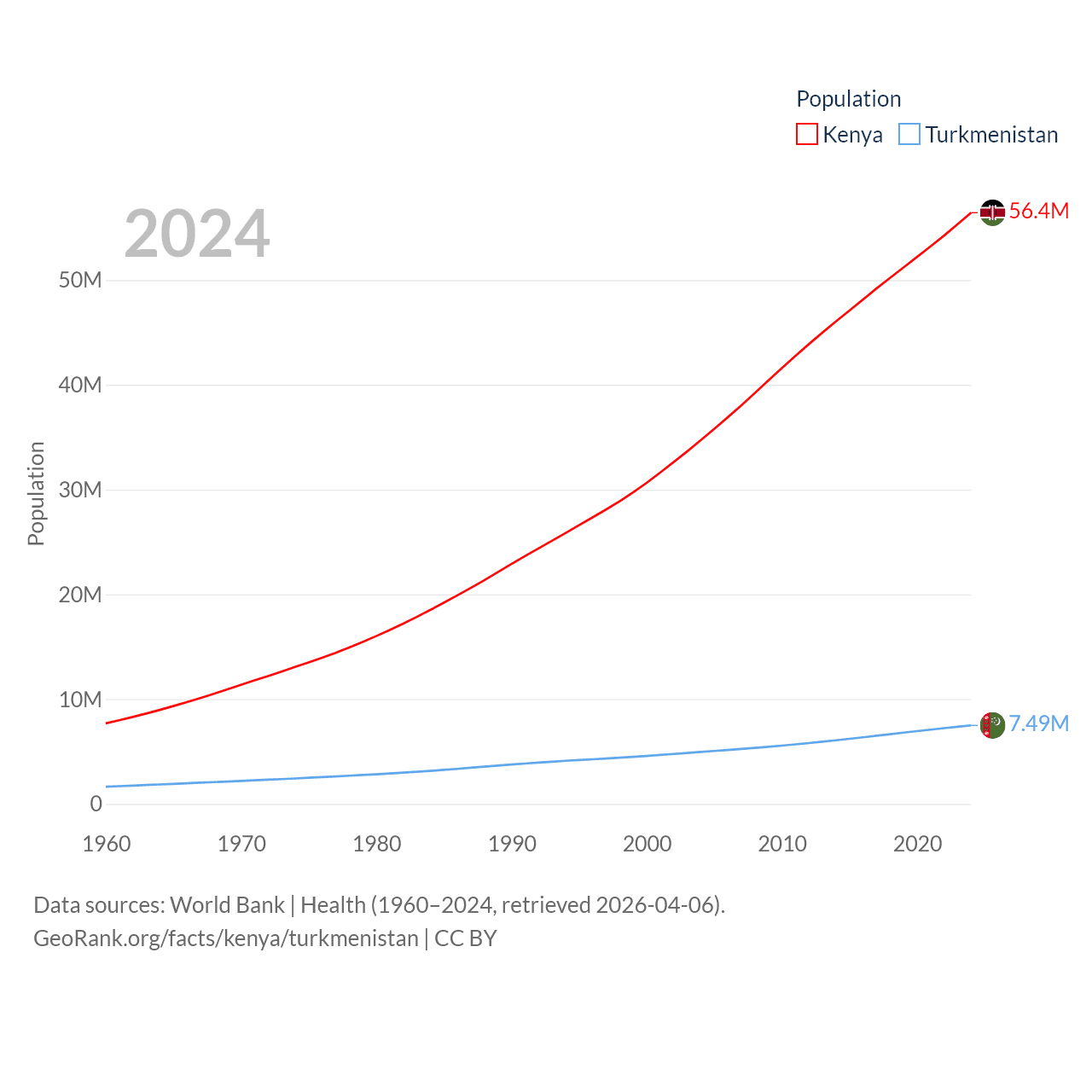 Kenya has a population of 56.4M (ranked 26/197), compared with 7.49M in Turkmenistan (ranked 104/197). Kenya's land area is 224,278 sq mi versus 181,441 sq mi for Turkmenistan (ranked 45th vs. 53rd).