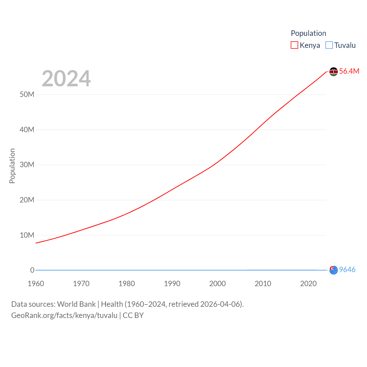 Kenya has a population of 56.4M (ranked 26/197), compared with 9.65K in Tuvalu (ranked 196/197). Kenya's land area is 224,278 sq mi versus 11.6 sq mi for Tuvalu (ranked 45th vs. 194th).