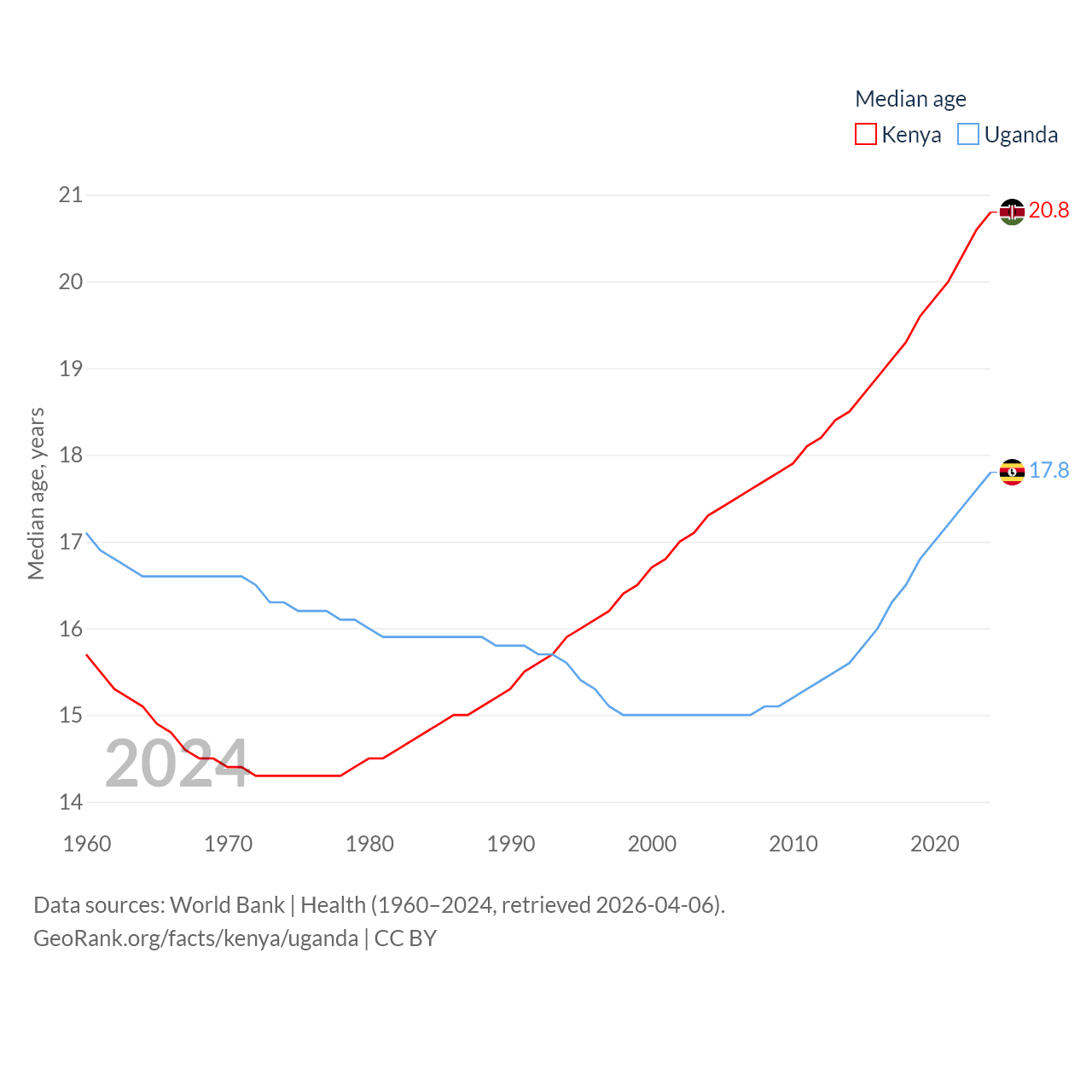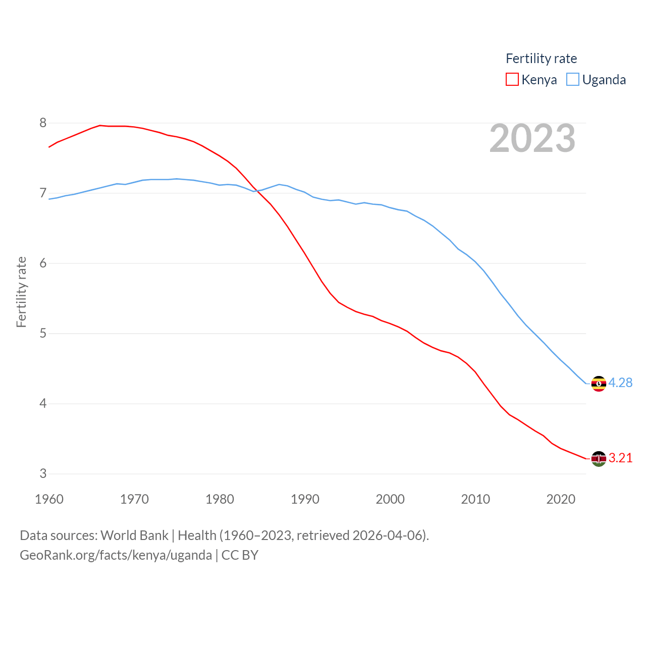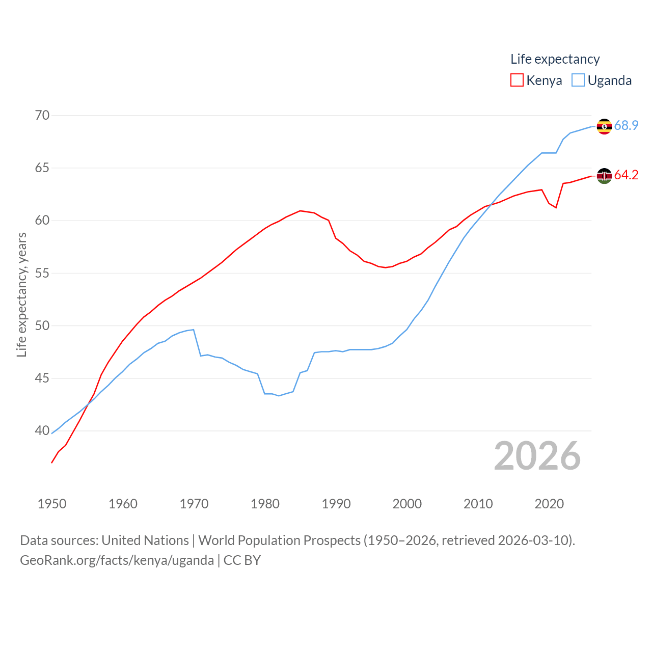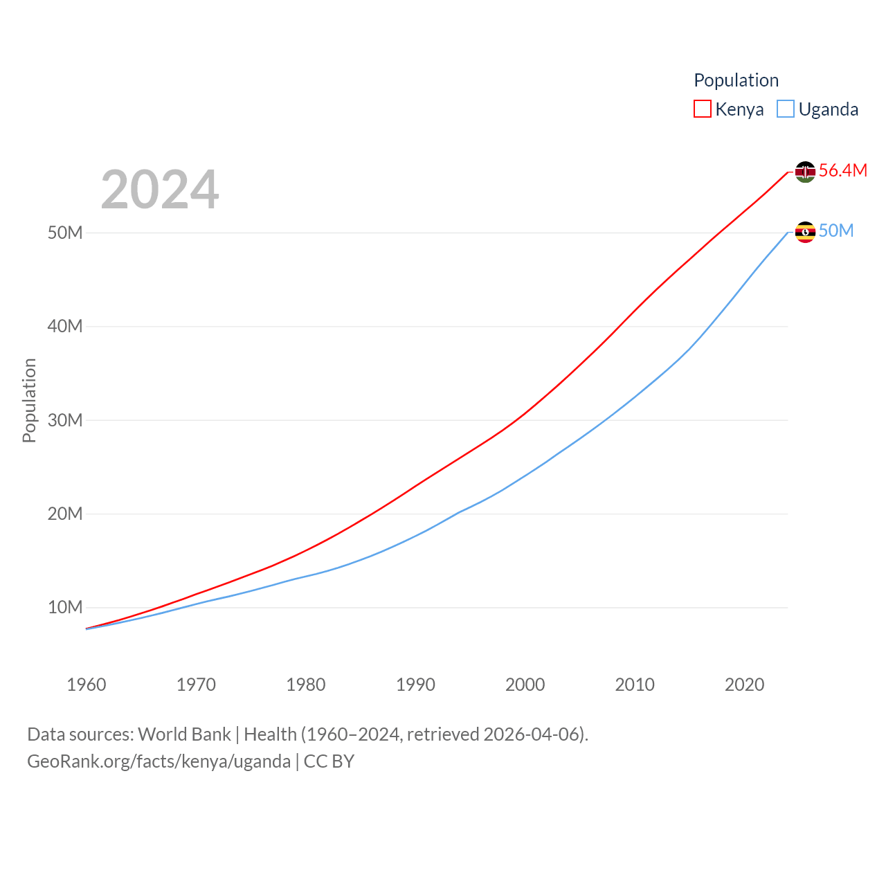 Kenya has a population of 56.4M (ranked 26/197), compared with 50M in Uganda (ranked 31/197). Kenya's land area is 224,278 sq mi versus 77,421 sq mi for Uganda (ranked 45th vs. 84th).