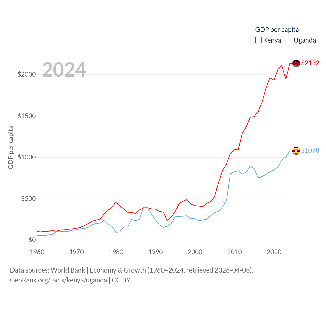 By GDP, Kenya ranks 64/197 ($120B) and Uganda ranks 89/197 ($53.9B). By GDP per capita, Kenya ranks 154/197 ($2,132), while Uganda ranks 176/197 ($1,078).